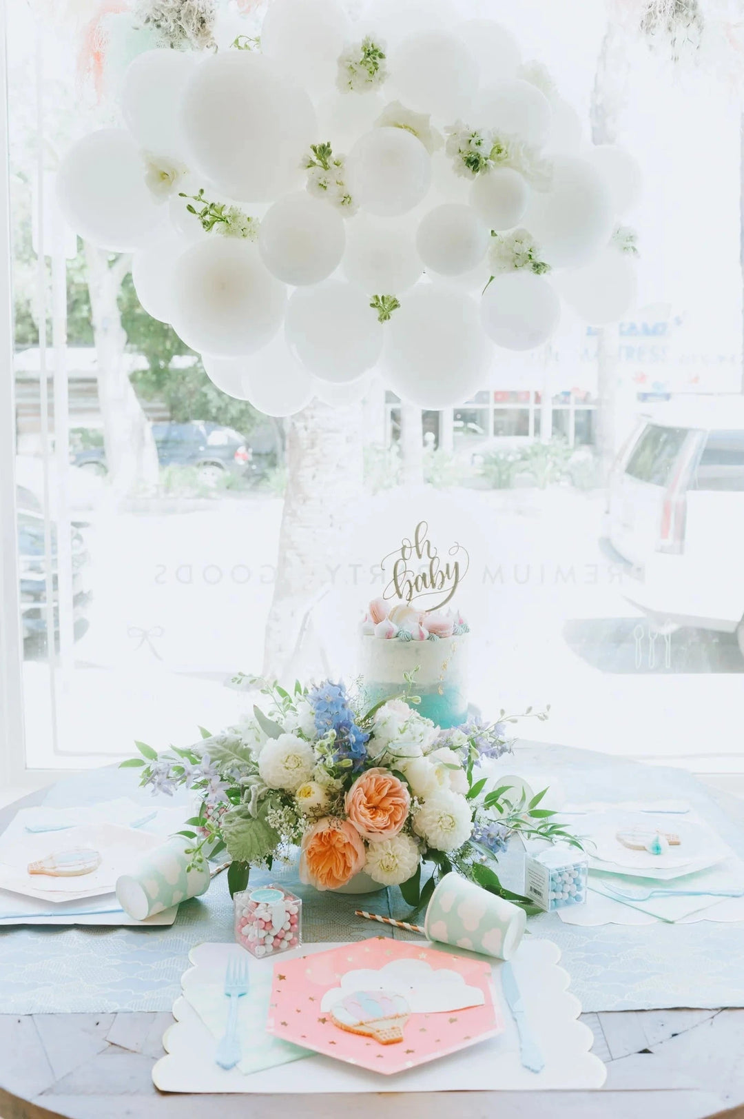 Traditionally, blue balloons are reserved for baby boy decorations and pink balloons are for baby girl decorations. For gender reveals, simply mix the two together. Though, if you’d rather pass on the classics, neutral balloons are a wonderful gender-neutral decoration idea! You can even interlace flowers with the balloons to make the decor feel more sophisticated.