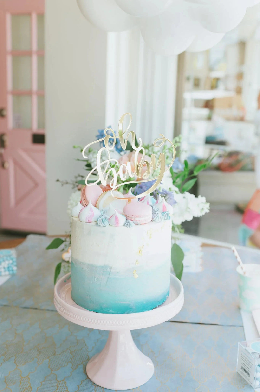 A cake is an essential element of any baby shower, and many sources of inspiration exist for baby shower cake ideas. We suggest adding a thematic touch with a baby shower cake topper and color-coordinating sprinkles.