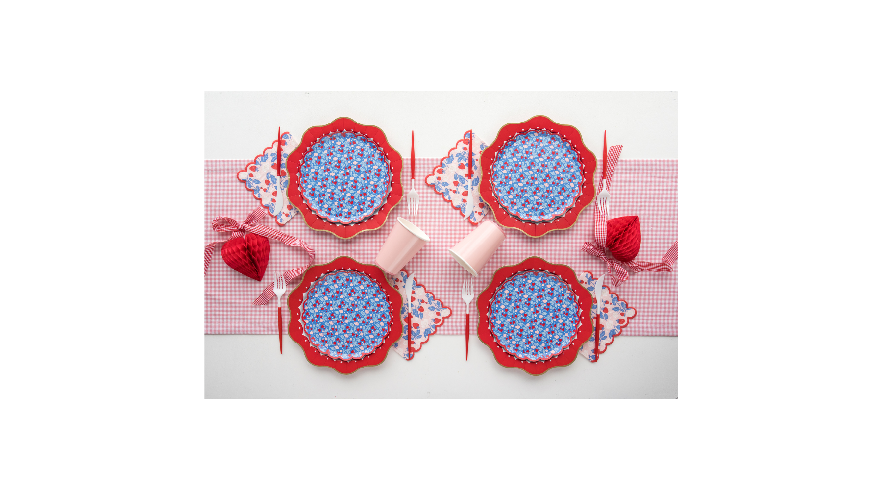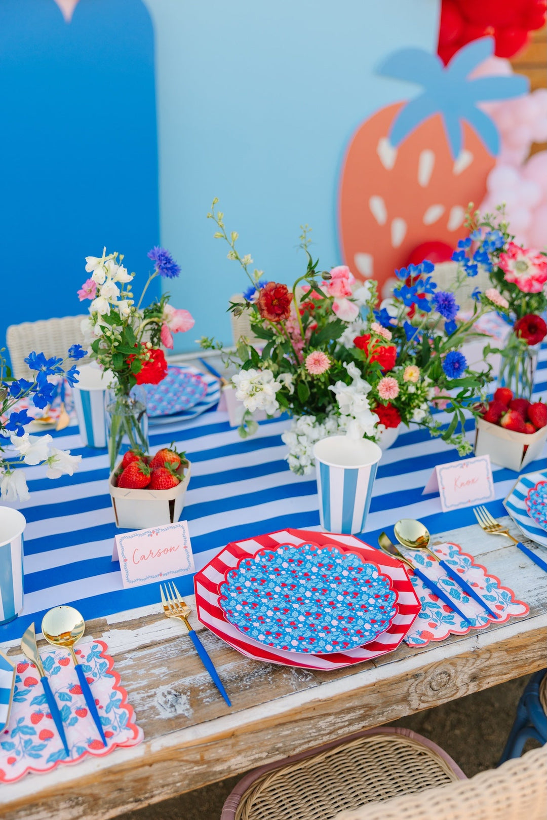 If you’re hosting a 4th of July party or a Summer soirée, we suggest bringing a bit more blue with our Summer Strawberry Table Runner or our Palisades Blue Signature Cabana Stripe Table Runner. Complete the look by swapping in our Petal Pink Elegant Floral Dinner Plates and Petal Pink Cups. Or, play up with red like @beijosevents and use our Pink & Red Signature Cabana Stripe Plates.