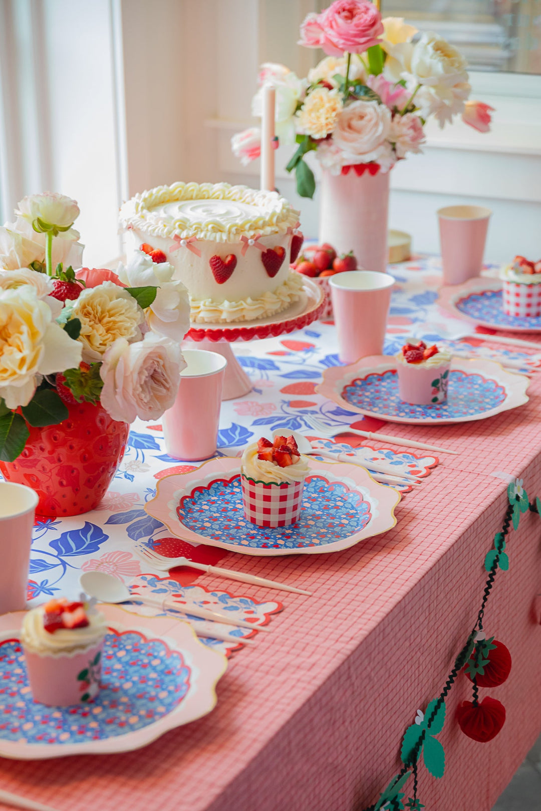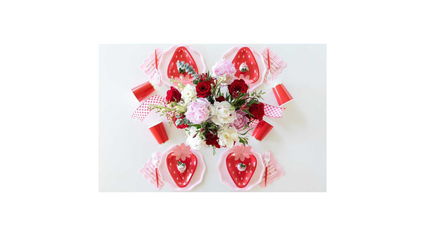 The tablescape should be the focal point of your fête. Start with a red or pink gingham tablecloth to give the table a rustic yet elegant feel. Next, set each place with a large plate in the same colorway– our Pink & Red Signature Cabana Stripe Plates are great for any “berry” merry gathering. Layer these strawberry-shaped plates or our Summer Strawberry Small Plates on top, and complete the look with coordinating Napkins, cups, and cutlery. From our Red & Pink Signature Bow Napkins to our Cherry Red Signature Cabana Stripe Cups, there are plenty of pretty pairings to try for this theme!