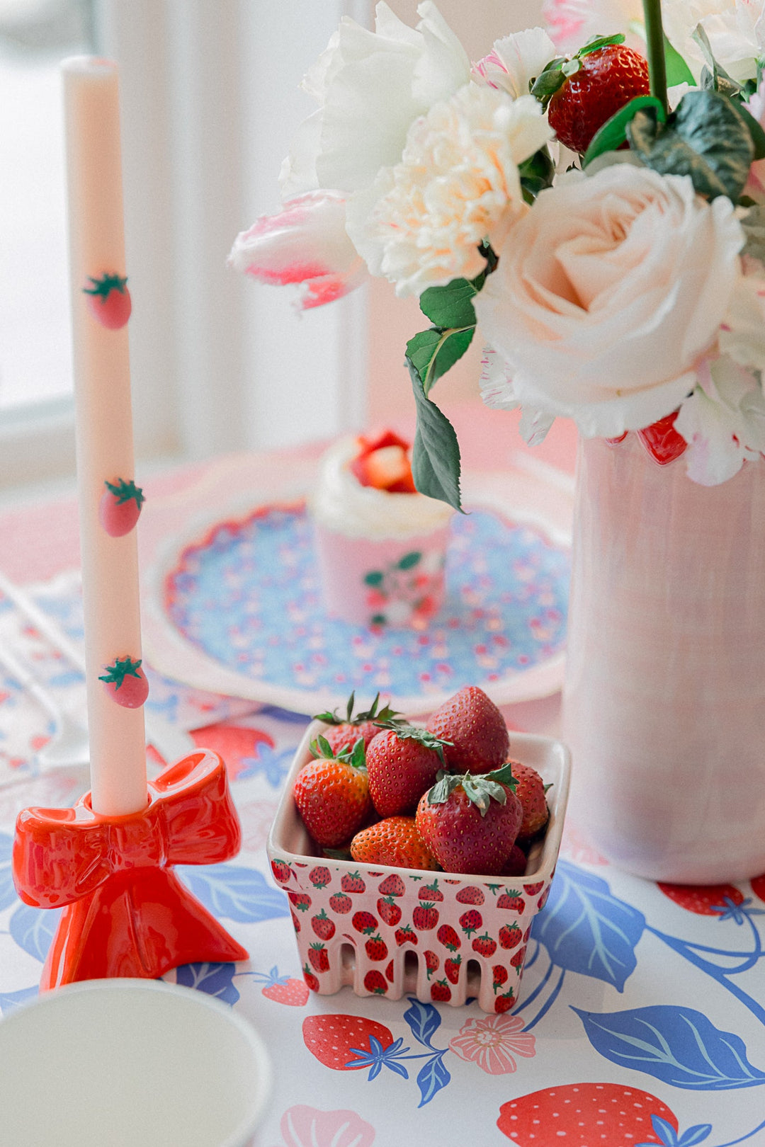 If you want to take your tablescape to the next level, scatter some strawberry-themed accents along the center. Pairing a ceramic strawberry basket with a bow vase and a strawberry candlestick instantly adds dimension and makes your setup even sweeter. Complete the look with a strawberry vase and a fresh flower arrangement like @golden.sol.floralco did here!