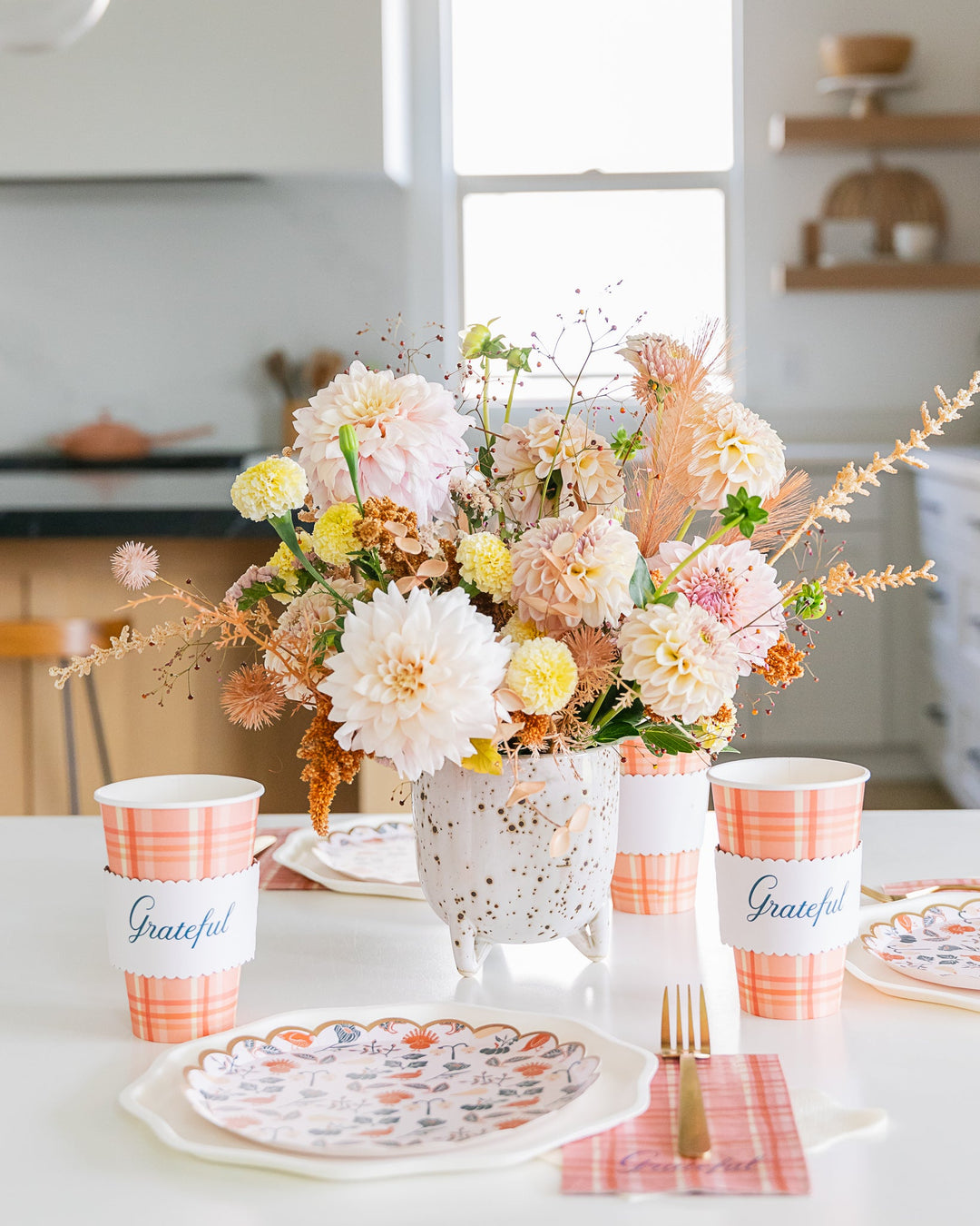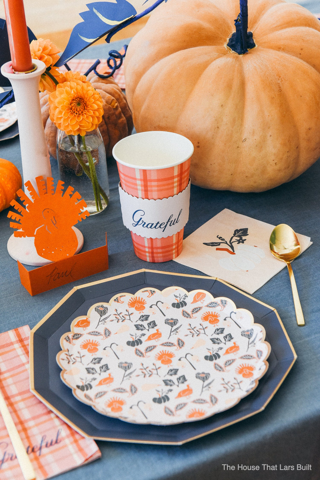 This collection has a delightful autumnal color palette with warm peach and orange tones, crisp navy details, and a pop of gold foil. Our Bonjour Fête x The House That Lars Built Thanksgiving Small Plates feature a print of turkeys, gourds, and florals that’s playful enough for kids’ parties, yet elevated for formal gatherings. While the guest towels and coffee cups feature a rich plaid pattern– another versatile design perfect for every fall party theme.