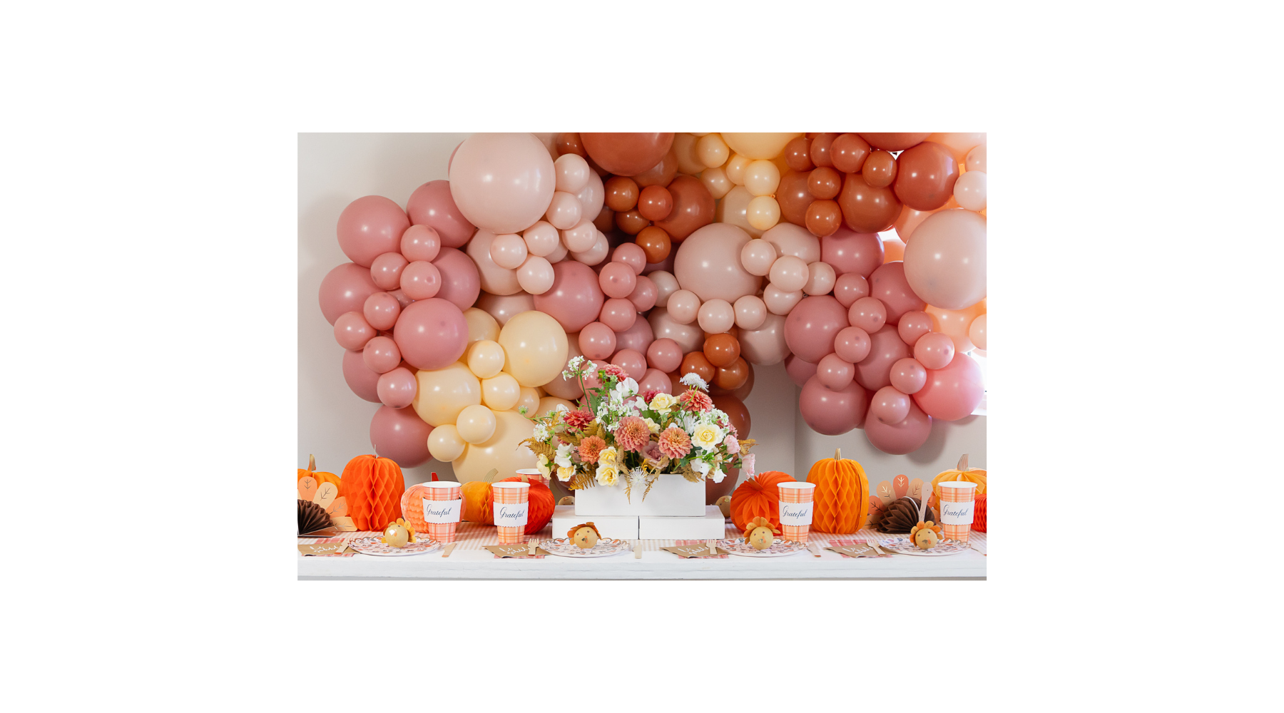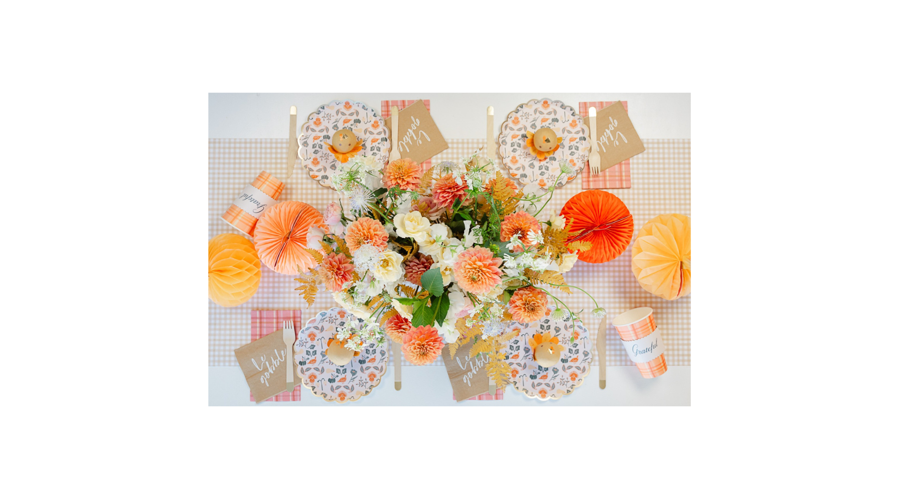 If you’re planning a kid’s Thanksgiving party, we suggest highlighting these cozy fall colors with a coordinating balloon arch and floral bouquet. The lovely Pop Park City and Flower Bar Co lent their talents to help us create this terrific turkey table. We loved their use of warm tones and blushes; these accents blended well with our collection, resulting in a beautiful aesthetic. To tie the entire celebration together, we also added honeycomb pumpkins and turkey decorations.