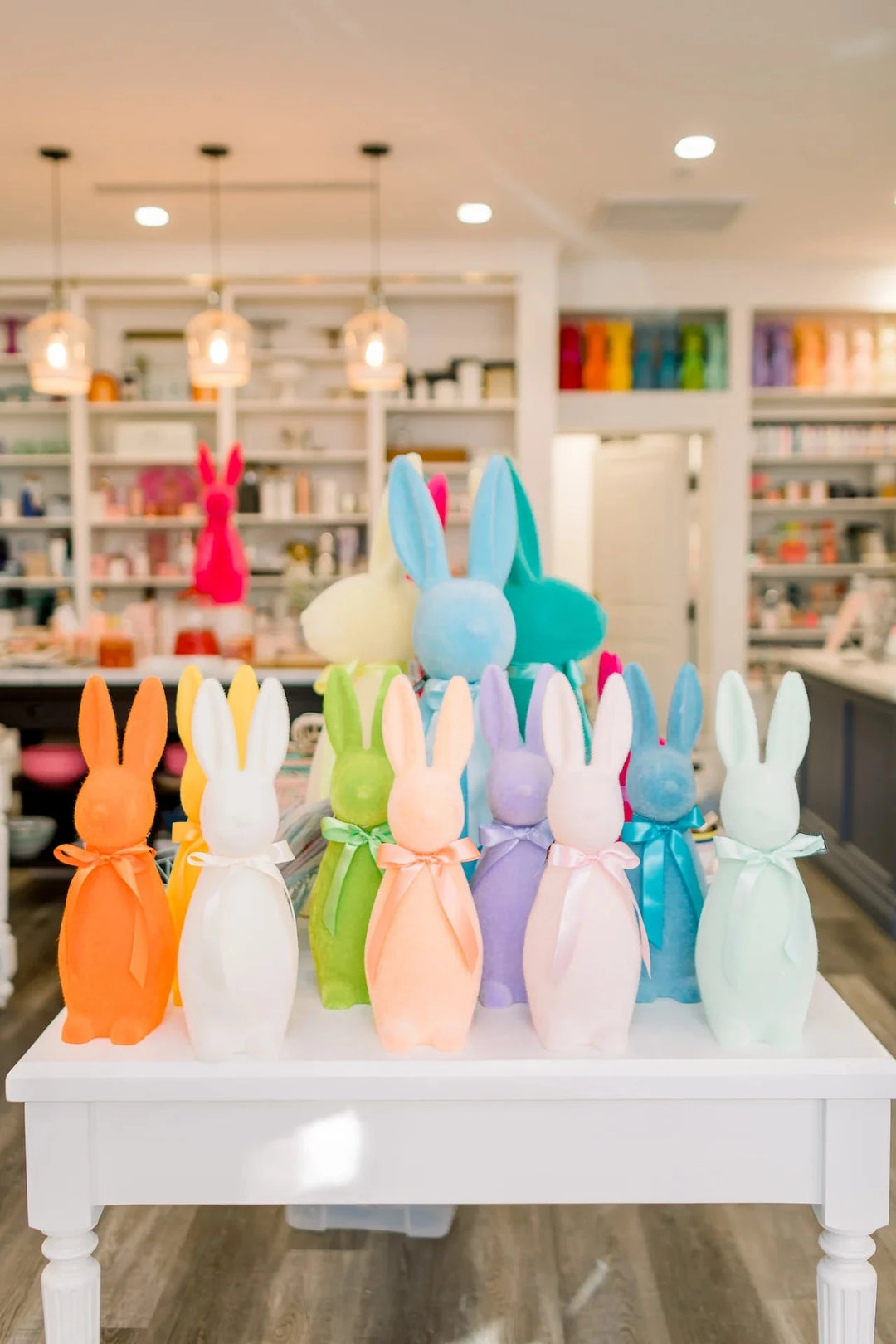 Our bright flocked bunny collection consists of rabbits with long ears, button noses, and darling ribbon bow ties. Since they’re tall in stature, but don’t take up too much space length-wise, they’re great for shelf or mantle styling.