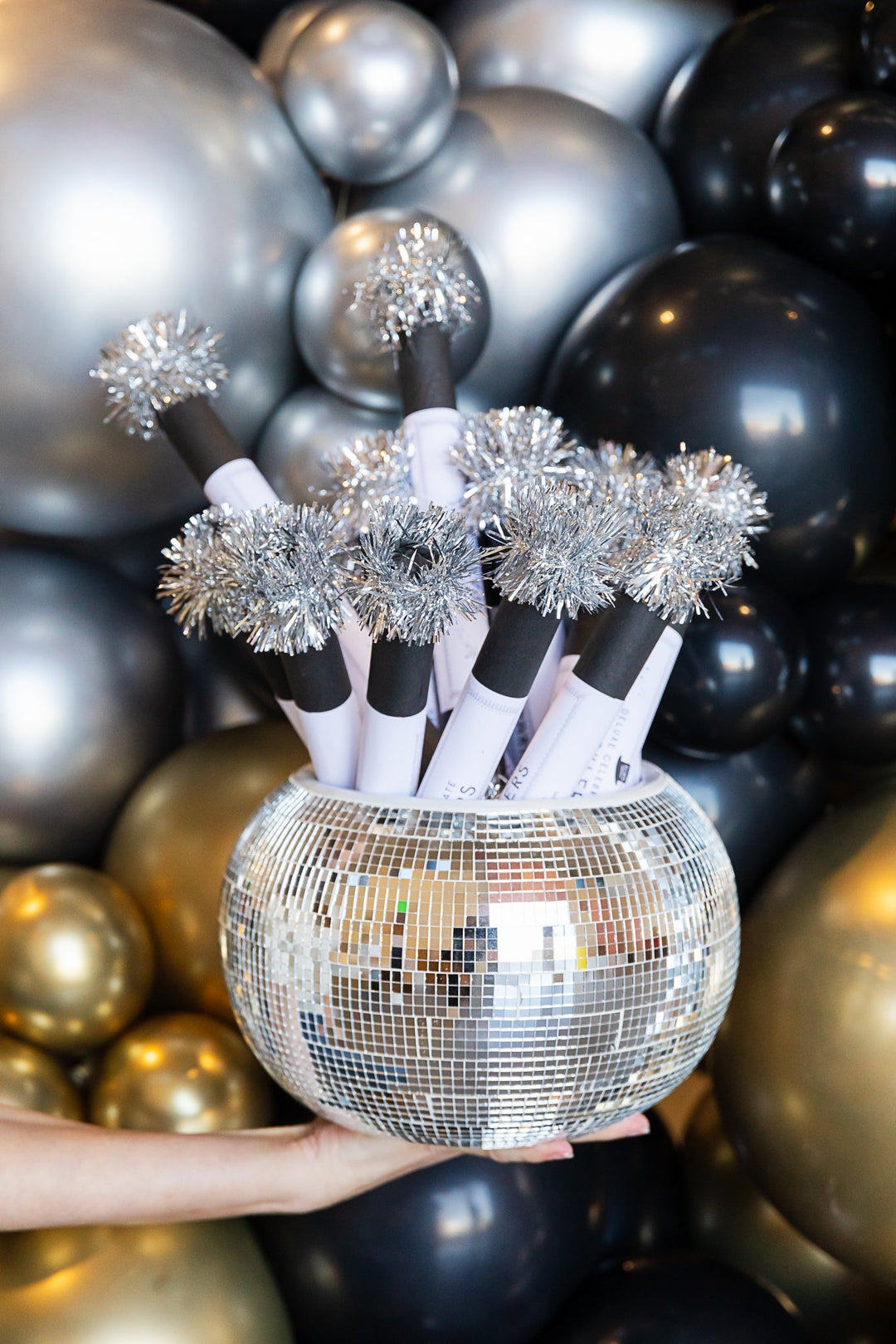 New Year's Eve party favors are crucial, so don't be afraid to go all out. We suggest gathering some sparklettes, party horns, and crackers to display on your bar cart or party table. Arrange them in a large disco bowl to create a dazzling DIY centerpiece!