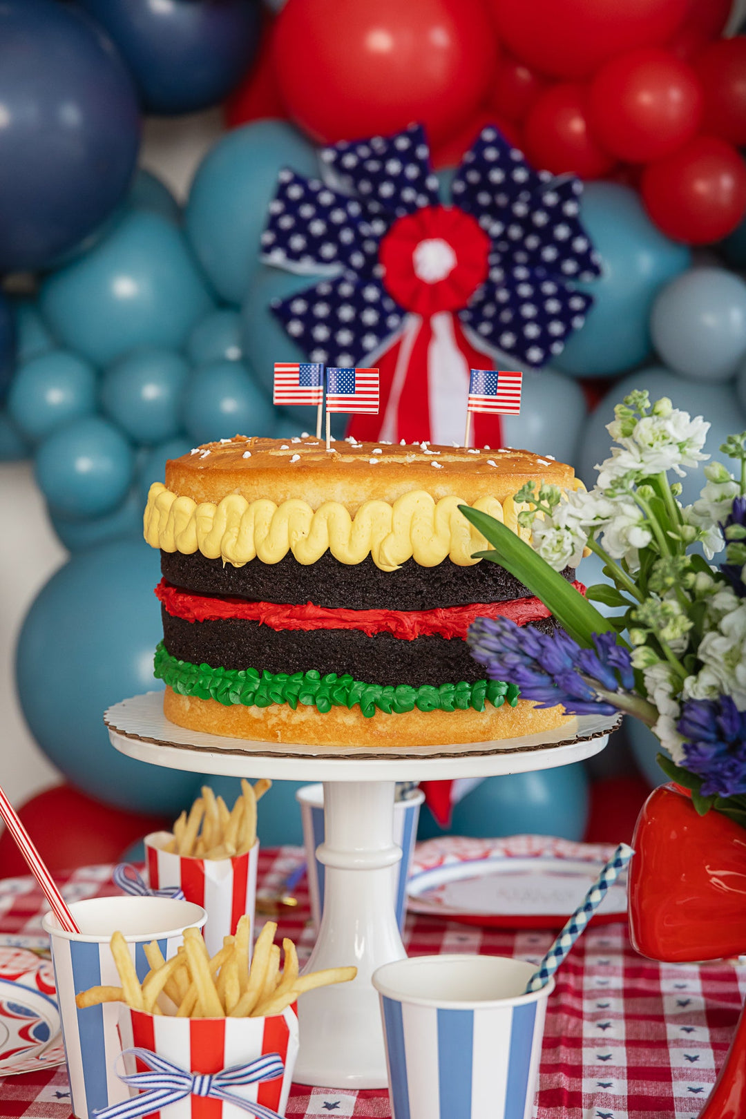 If you’re craving a unique 4th of July dessert, a hamburger-shaped cake is guaranteed to please! Made to look like a burger dressed in condiments, it’s easy to make and perfect for turning heads at any celebration. (Check out our DIY Hamburger Cake blog post for the full recipe!)