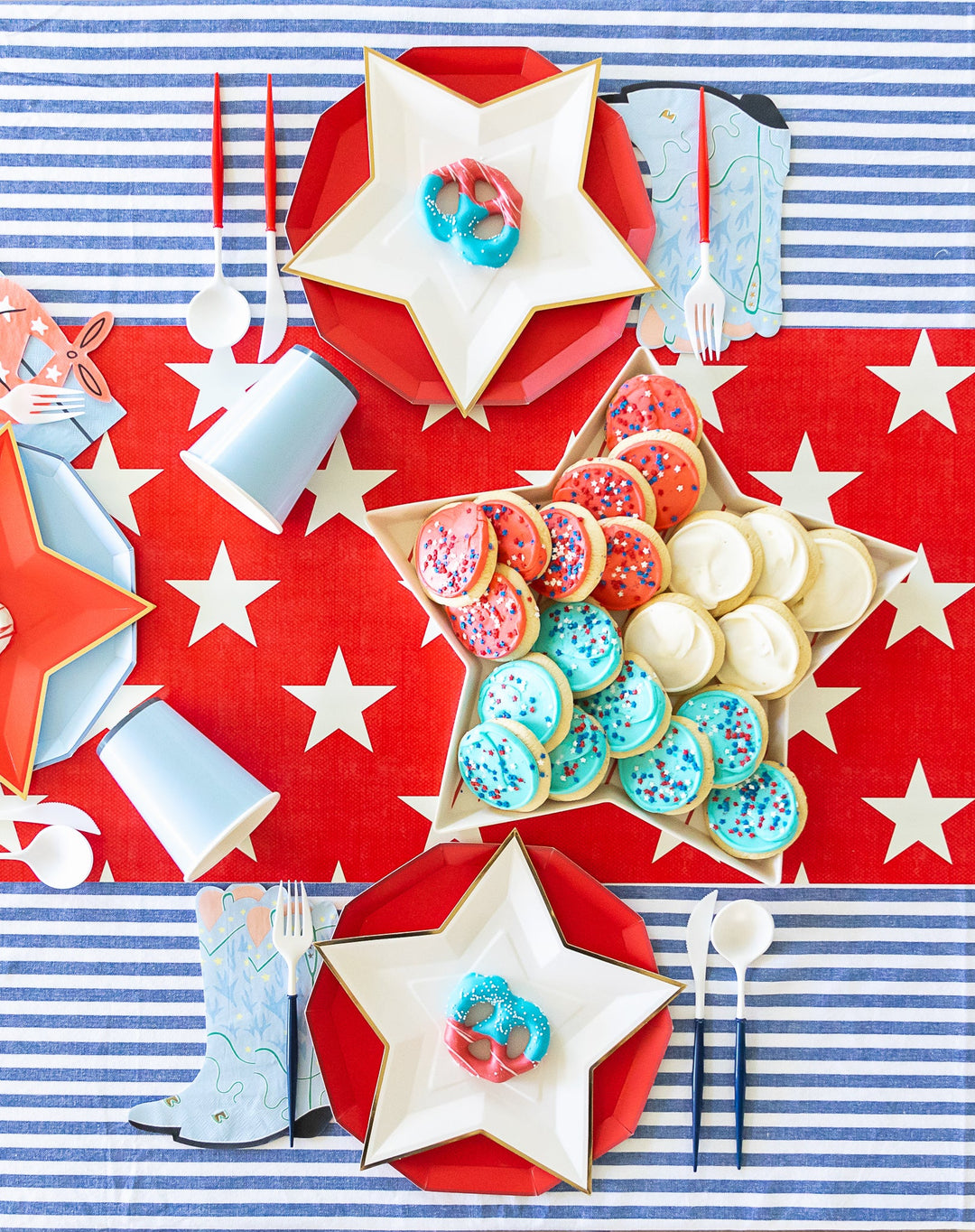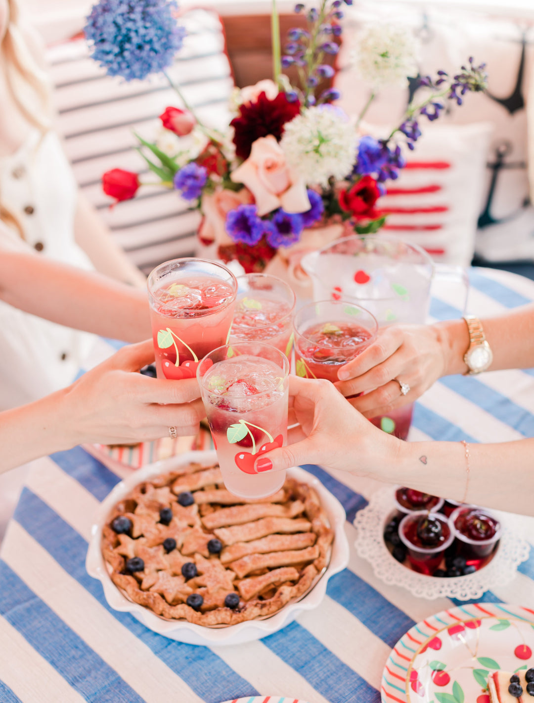 No 4th of July party is complete without a decked-out dessert table. A classic cherry pie screams Americana and looks beautiful displayed on a blue-striped table covering. For a sophisticated touch, create a flag shape for your top crust, complete with dough stripes and star embellishments.