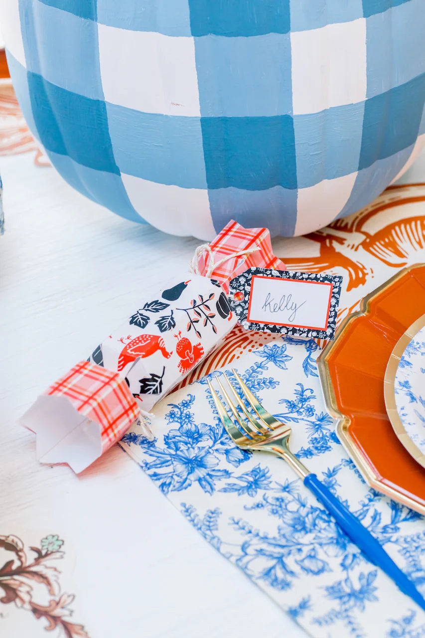Now let's move on to the place setting and what your guests will be gobbling off of! These blue toile pumpkin plates are a necessity in this table-scape. Not only are they perfectly on-theme, they also look like fine dinnerware.