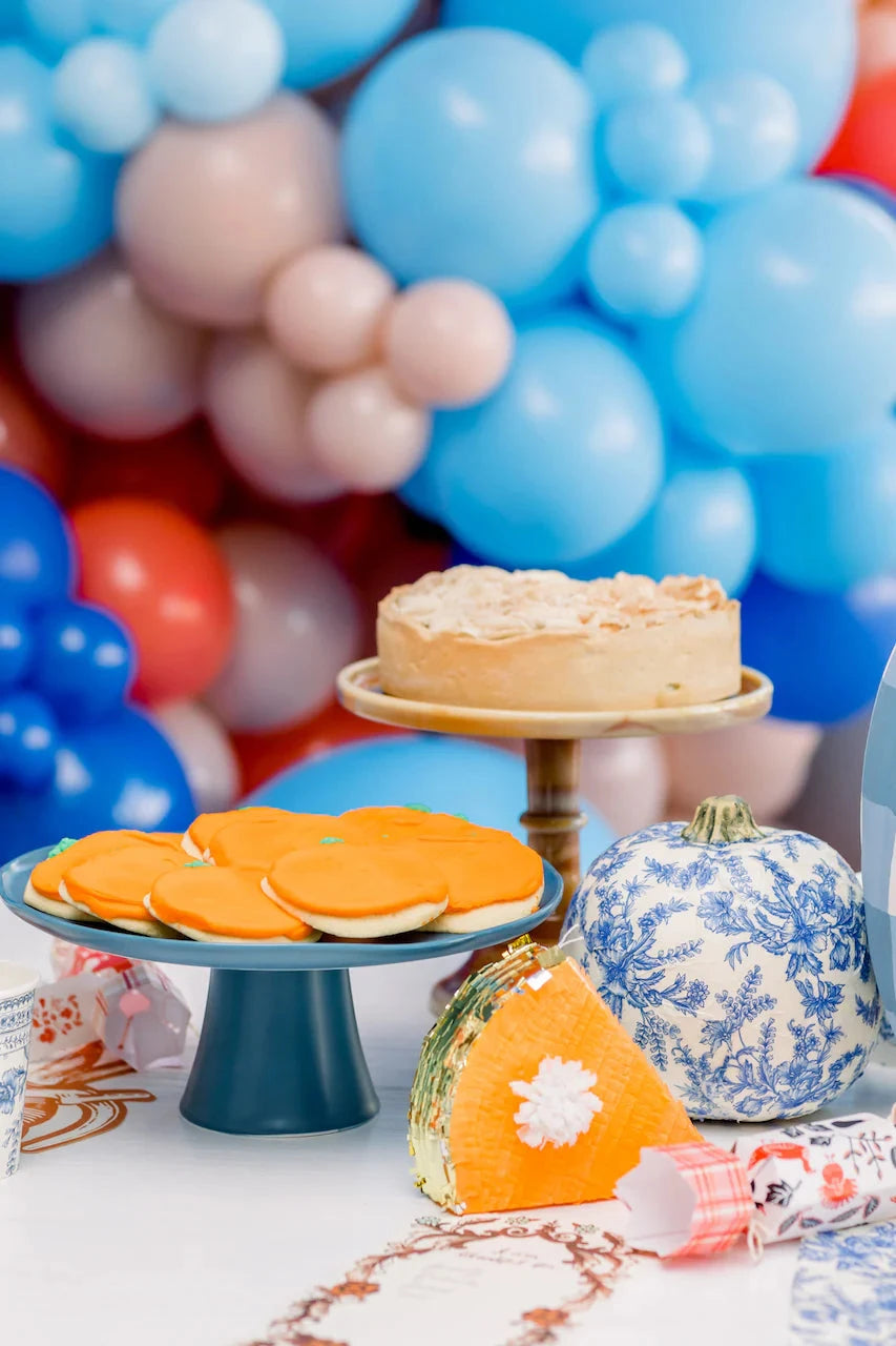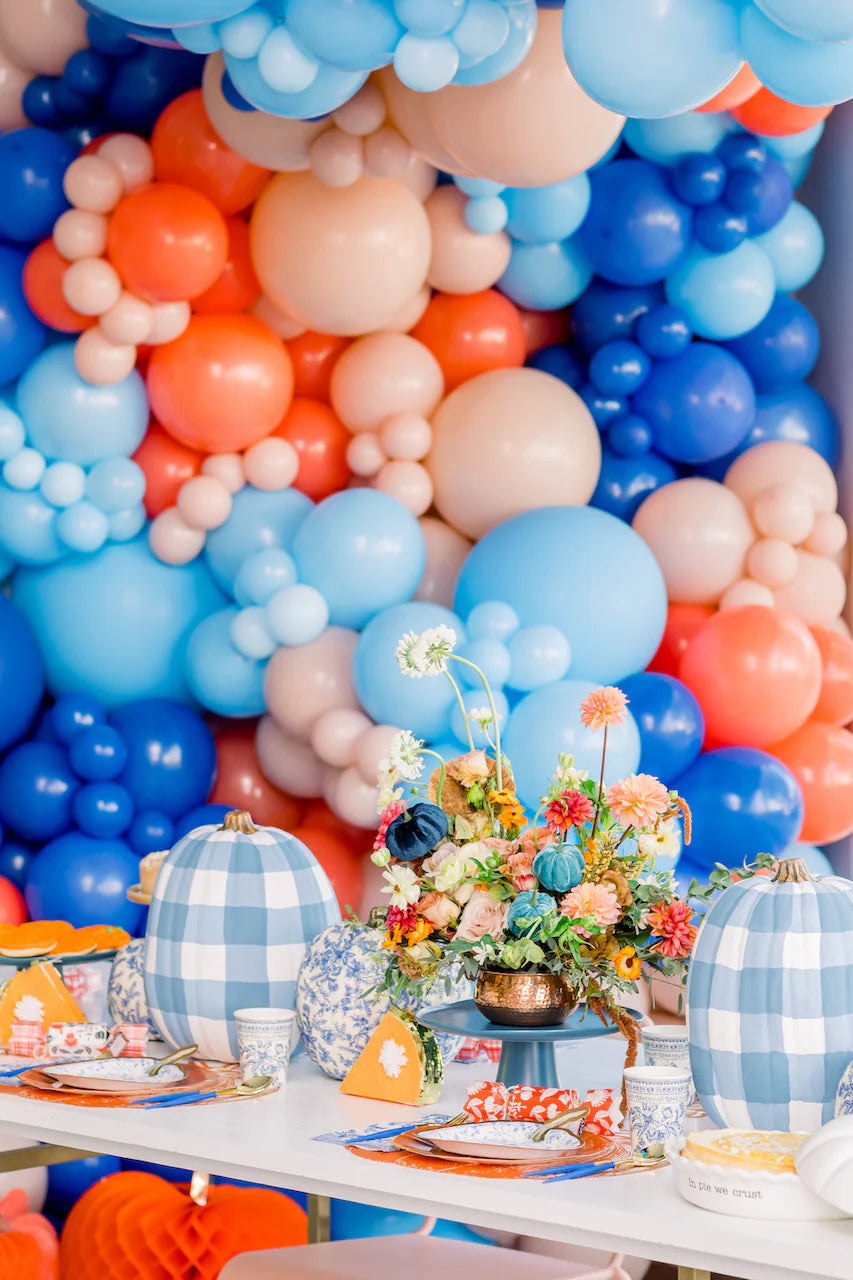 You know we couldn't resist setting up a balloon garland in this color scheme, so we gathered some blue and orange balloons in various sizes and tones. However, this Thanksgiving party is still so delightful in a minimalistic setting. Simply set up a few small fall decorations in coordinating blues and oranges, and your home is all ready for hosting! Easy Thanksgiving decor for the win!
