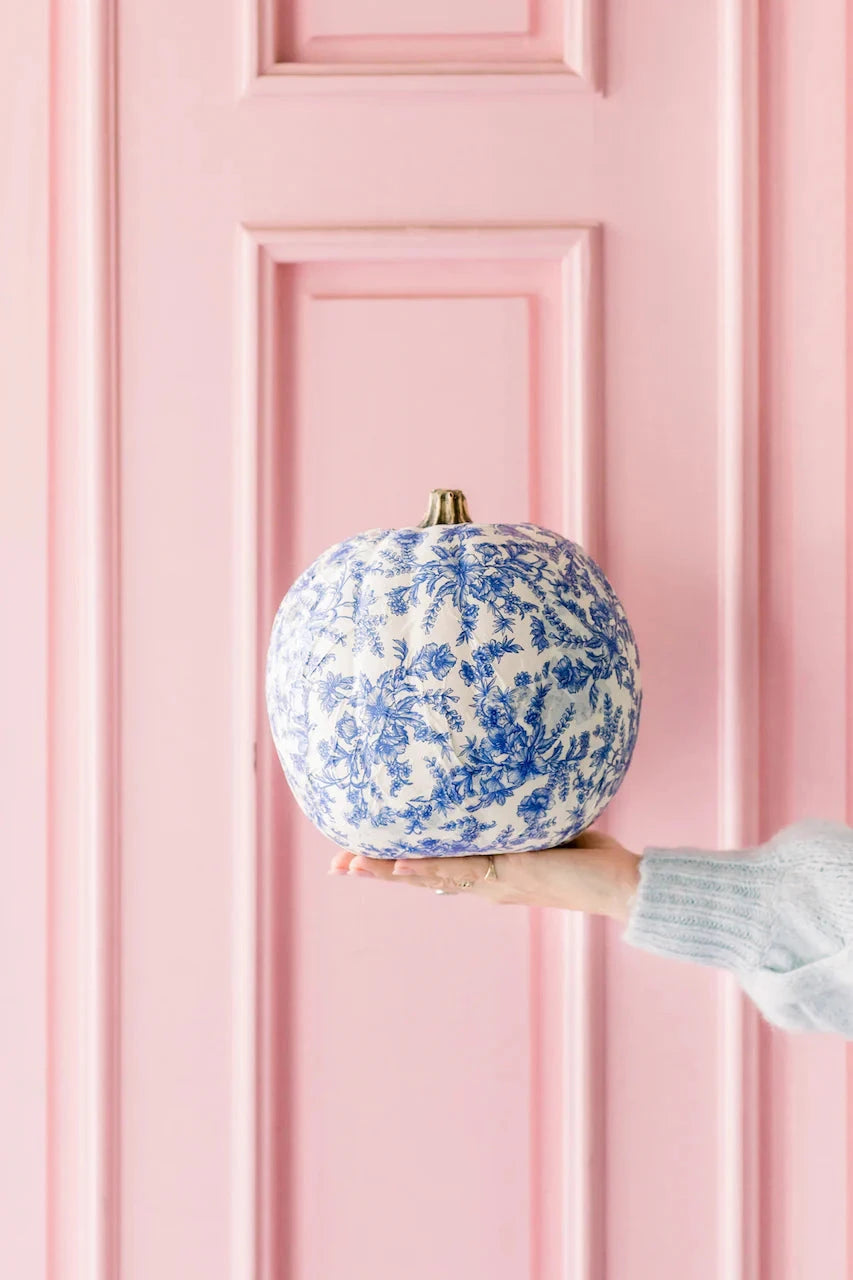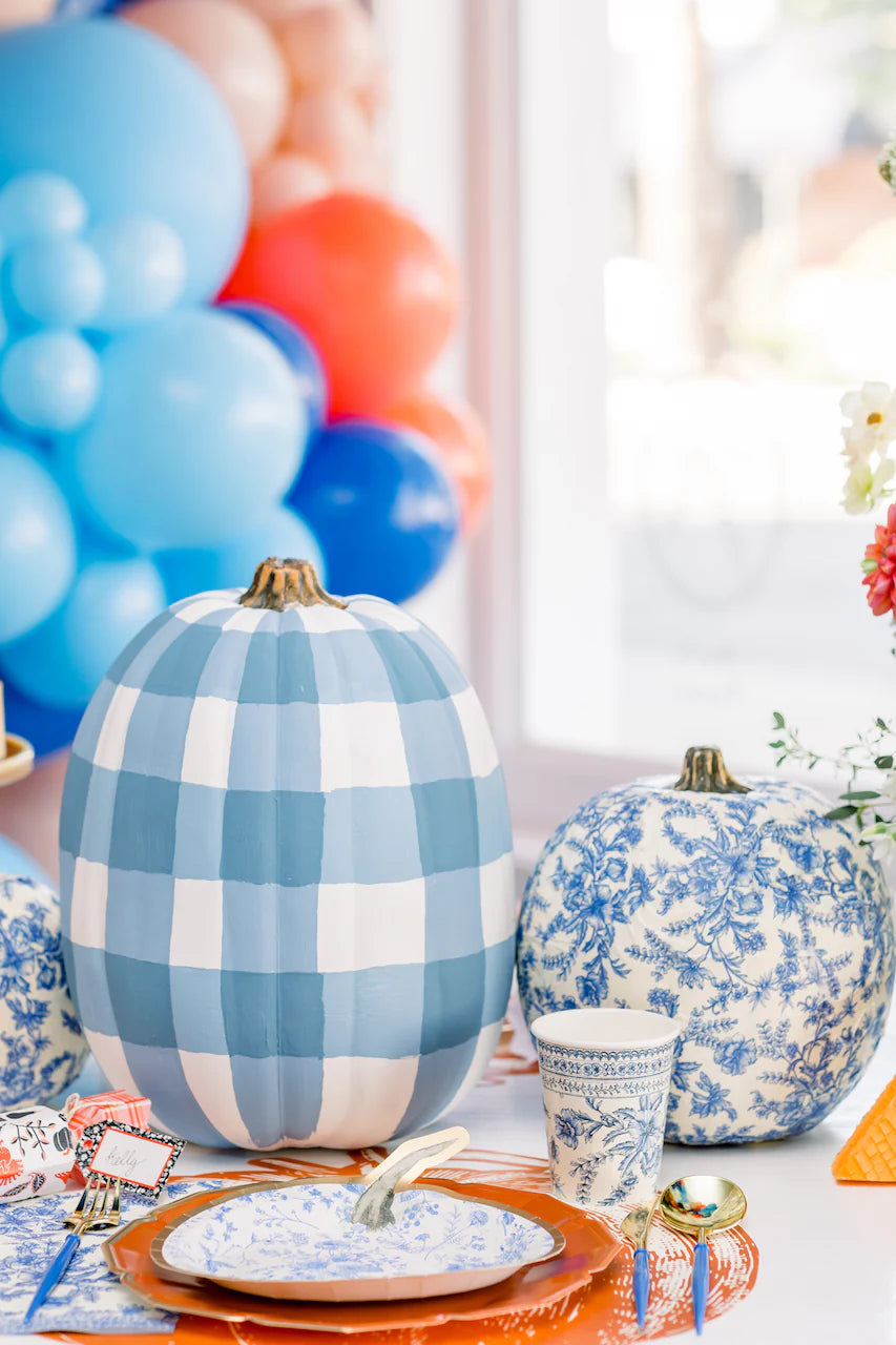 We made these blue toile and plaid pumpkins using acrylic paint, mod podge, and our blue toile napkins! We used foam pumpkins for this craft and lots of dusty blue and white paint. To paper mâche the toile pattern on, we pulled back the paper layer of the toile napkins and adhered the front to the surface of the pumpkin with mod podge.