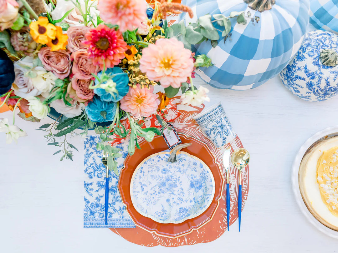 Blue isn’t typically included in the fall holidays, but if you pair it with the right details it blends beautifully into the autumn scene. Just be sure to incorporate pumpkin finishes, gold candle holders, and fall leaves into your tablescape as well.