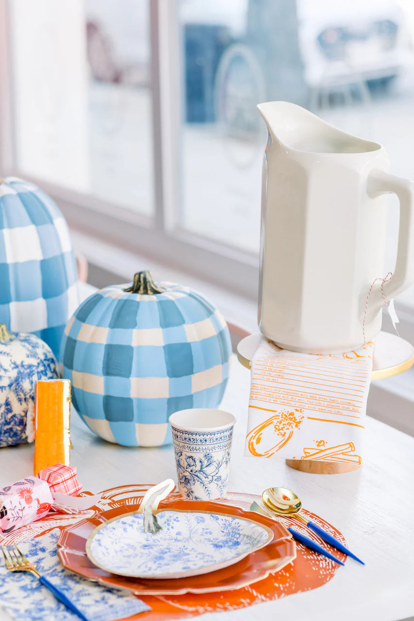 We still can’t get over how striking blue and orange look together, so for the rest of this set-up we used matching blue toile party cups, napkins, and cutlery. Then we tied it all together with an orange charger and these adorable pumpkin place mats. As for other details, we displayed white stone bakeware and fall themed textiles.
