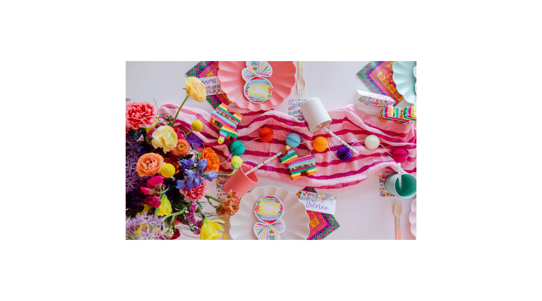 Now let’s dive into this brilliant table-scape. To begin, we styled a colorful honeycomb garland with a Colombian-inspired throw, and draped them both along the center of the table. This is an excellent idea if you don’t have a table runner and want to try a little DIY!