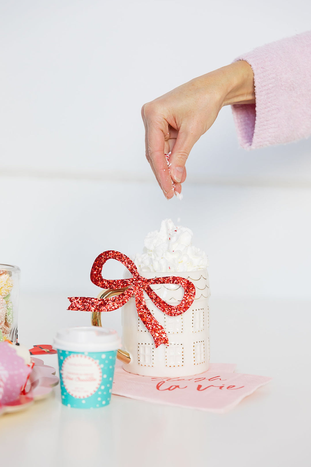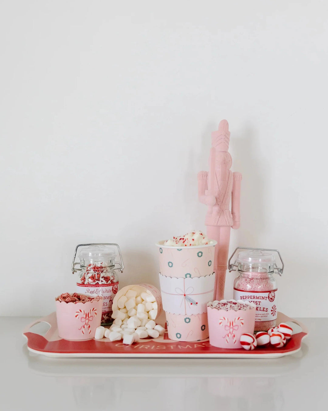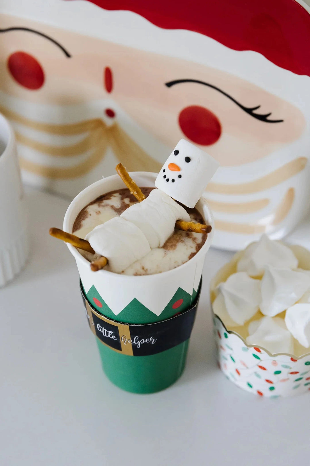 To create the perfect DIY hot cocoa bar, simply arrange your toppings in festive food cups on a large platter. Serve them alongside some mugs and napkins, en voila! Bon appetite!
