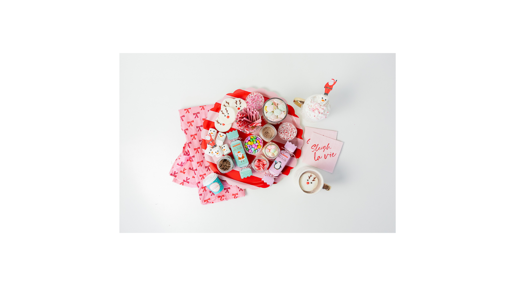 The only way to serve hot chocolate is with an entourage of toppings and mix-ins, so make sure to set aside some marshmallows and peppermint candies. Better yet, have yourself a merry little hot cocoa bar and fill an entire tray with an assortment of fun toppings. (These marshmallow snowmen are one of our favorite embellishments!)