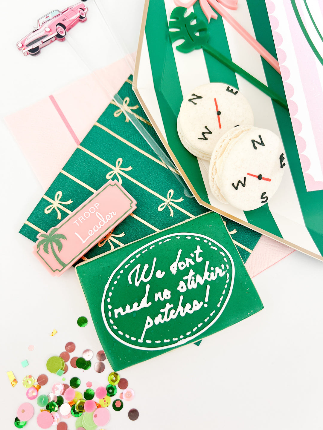 It's cookie time! In a nod to the troop’s hilarious cookie-selling debacle, Anna’s dessert table featured custom sugar cookies by @royallyiced and delicate macarons by @mac_lab. To channel the movie’s famous Beverly Hills Hotel spa scene, she gathered color-coordinating shower gels and bath bombs from @dabbleanddollop. Displaying them in a chic Fun Boy float, Anna had a cabana float fit for any wilderness jamboree!