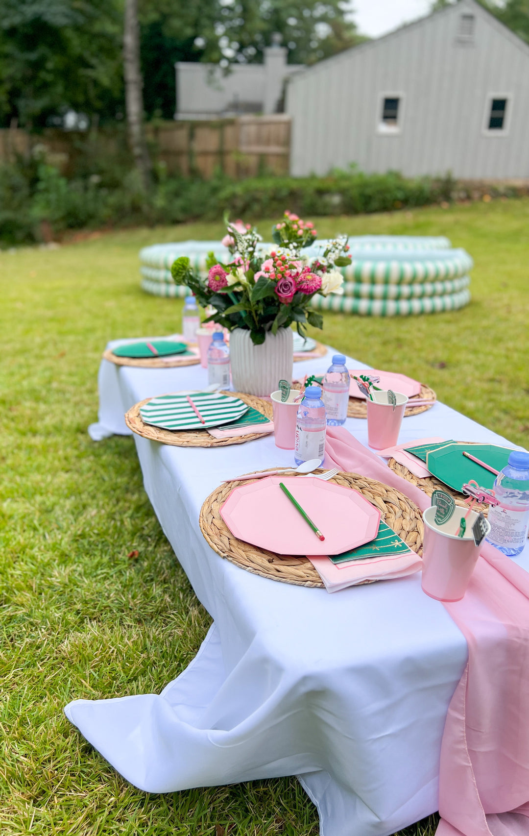 Anna went with a pink and green color scheme, pulling elements from the film’s Beverly Hills Hotel scene. She used various pieces from our Signature party supplies selection to create this chic outdoor tablescape.