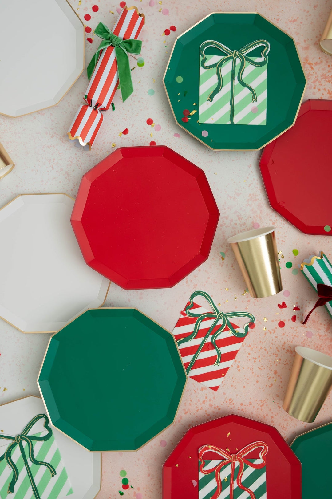 Start with a striped table runner in a classic Christmas color like emerald green. Then, layer a festive dinner-sized plate underneath a coordinating small plate, and select a complementary napkin and cup to complete the look. Our Christmas Plaid Dinner Plates and Large Napkins pair perfectly with any holiday theme. We suggest mixing and matching with our Pink Christmas Tree Small Plates and Christmas Tree Plaid Guest Towels for a flourish of nostalgia.