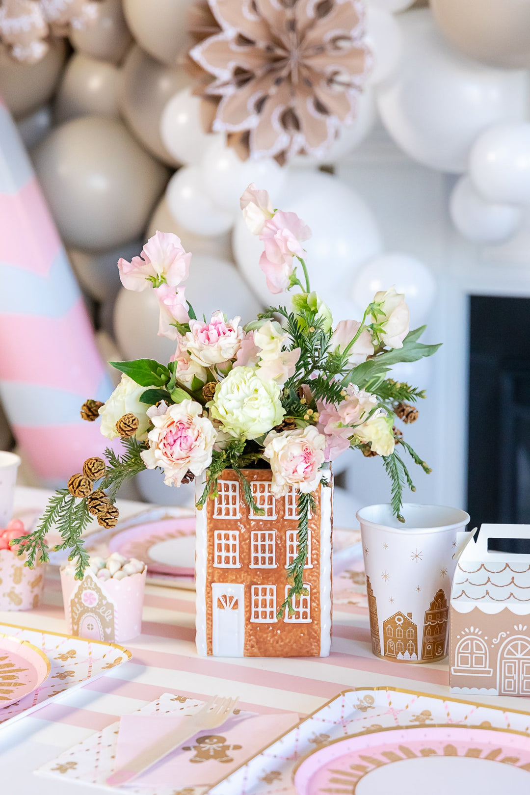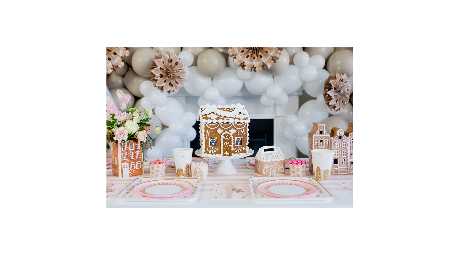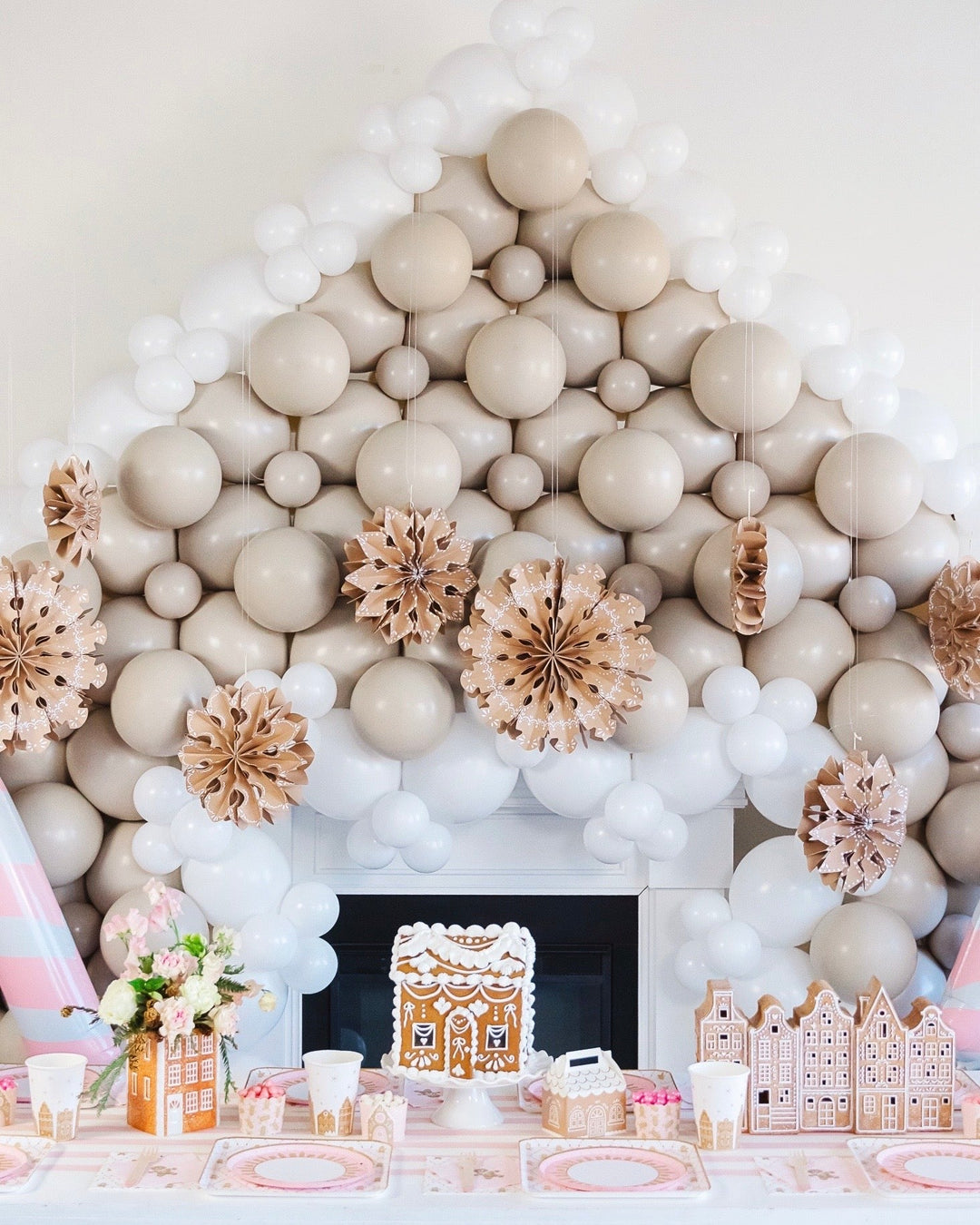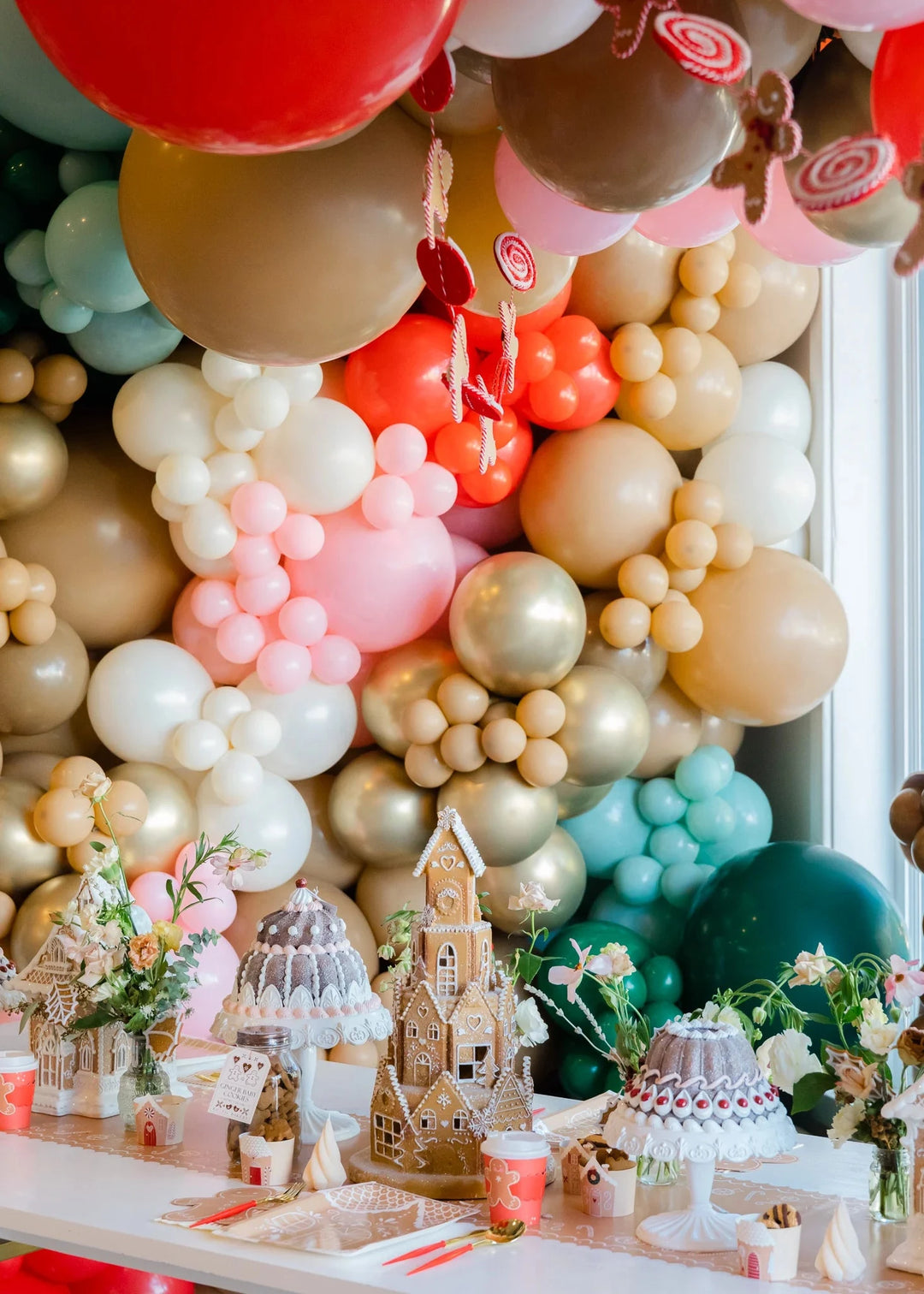 If you’re throwing a kid’s party, you can’t go wrong with a gingerbread house balloon installation. Pop Park City created this whimsical balloon backdrop, which we embellished with pink candy cane balloons and gingerbread party fans!