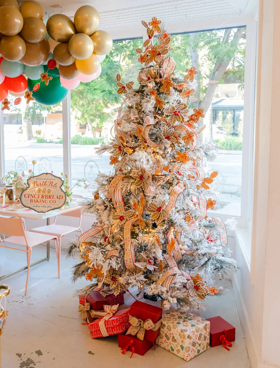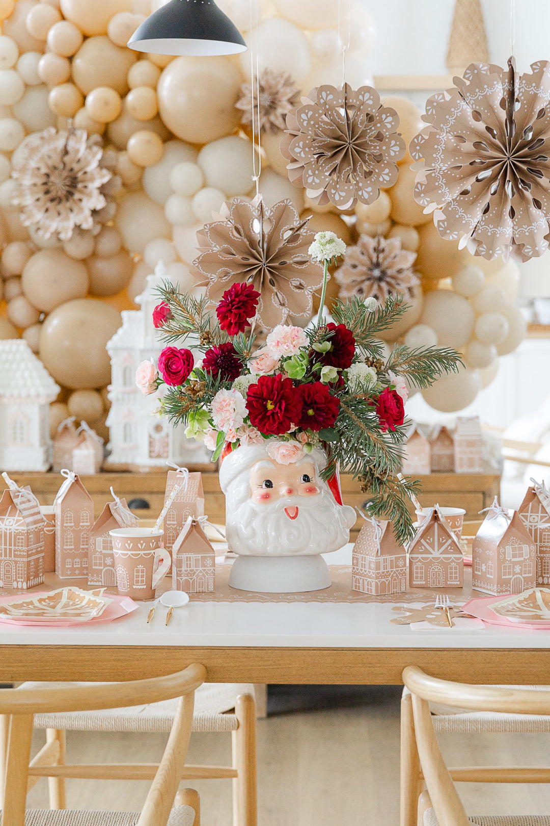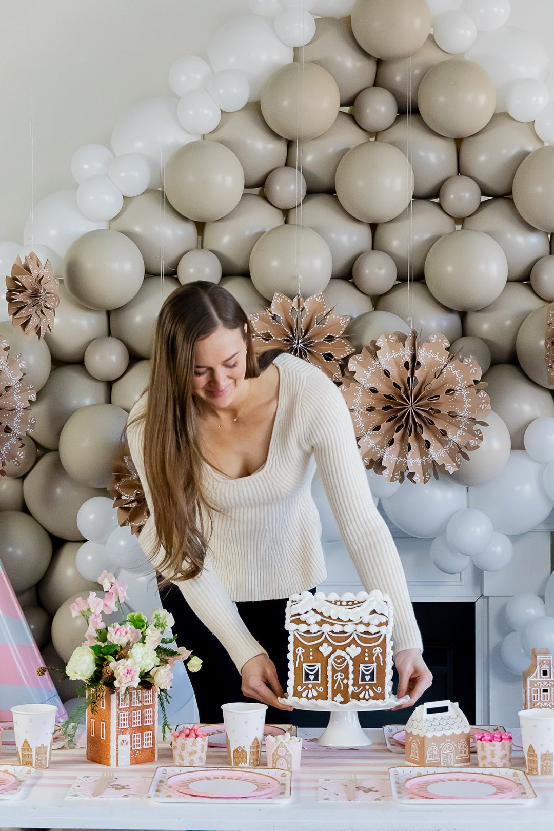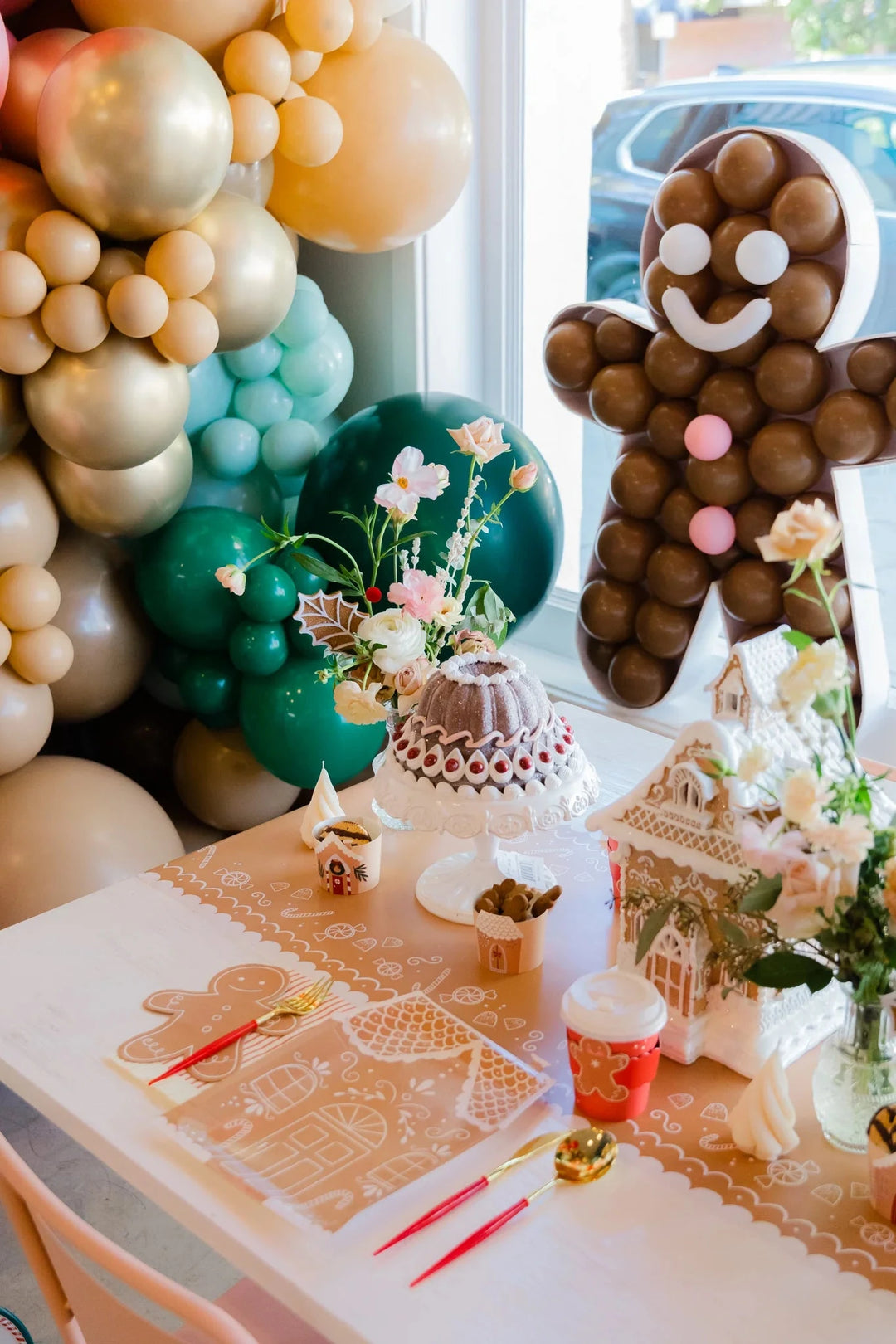 If you’re throwing a kid’s party, you can’t go wrong with a gingerbread house balloon installation. Pop Park City created this whimsical balloon backdrop, which we embellished with pink candy cane balloons and gingerbread party fans!