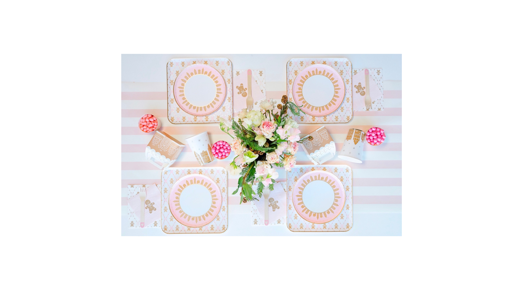 Start by layering our Pink Gingerbread Large Plates under our Small Plates. With their whimsical illustrations and gold foil details, they pair wonderfully with a variety of Christmas color palettes. Complete the look with our Pink Gingerbread Large Napkins, Small Napkins, and matching cups!