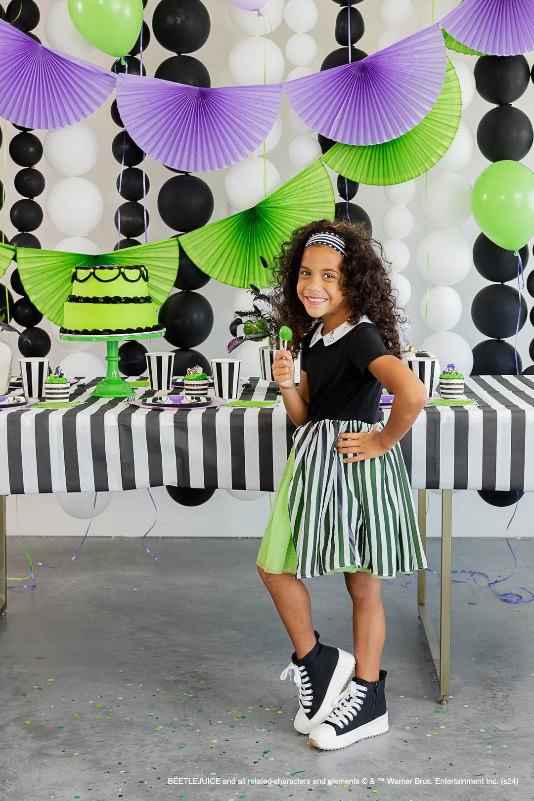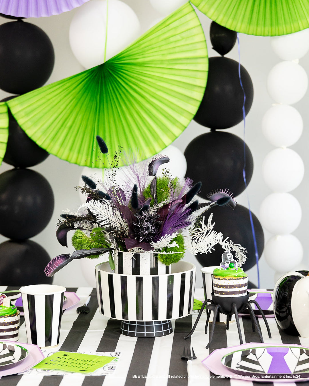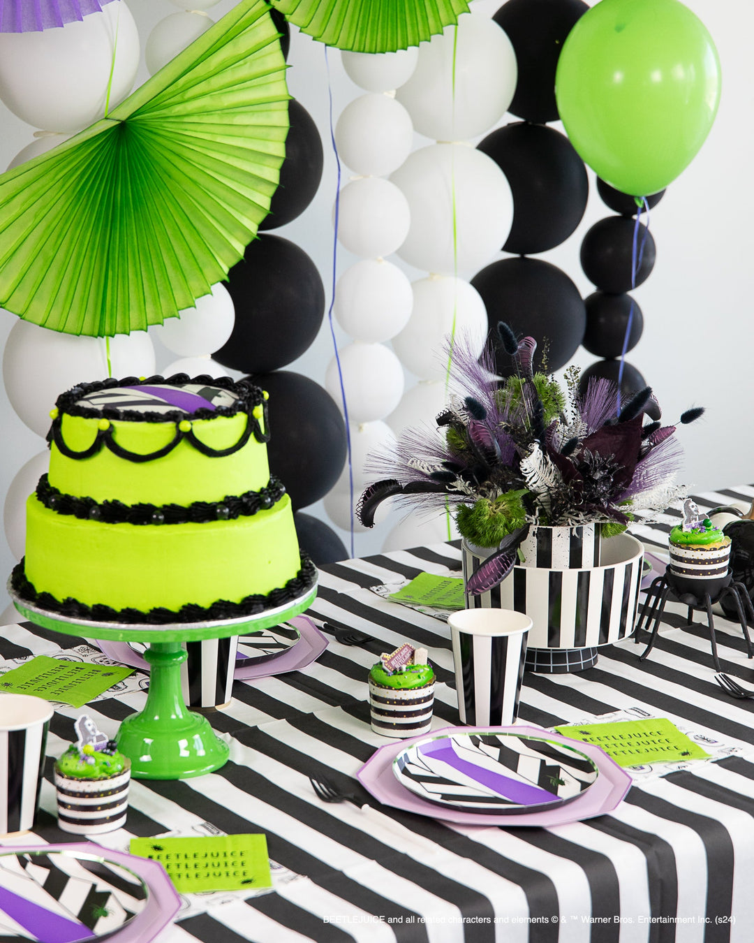 Start by transforming your party space into an 80’s mod mansion! Get crafty and decorate with DIY Beetlejuice party decorations like black and white streamers, party fans and balloons. You can never have too many black and white stripes with this party theme, but don’t be afraid to add a pop of purple and lime green to liven things up!