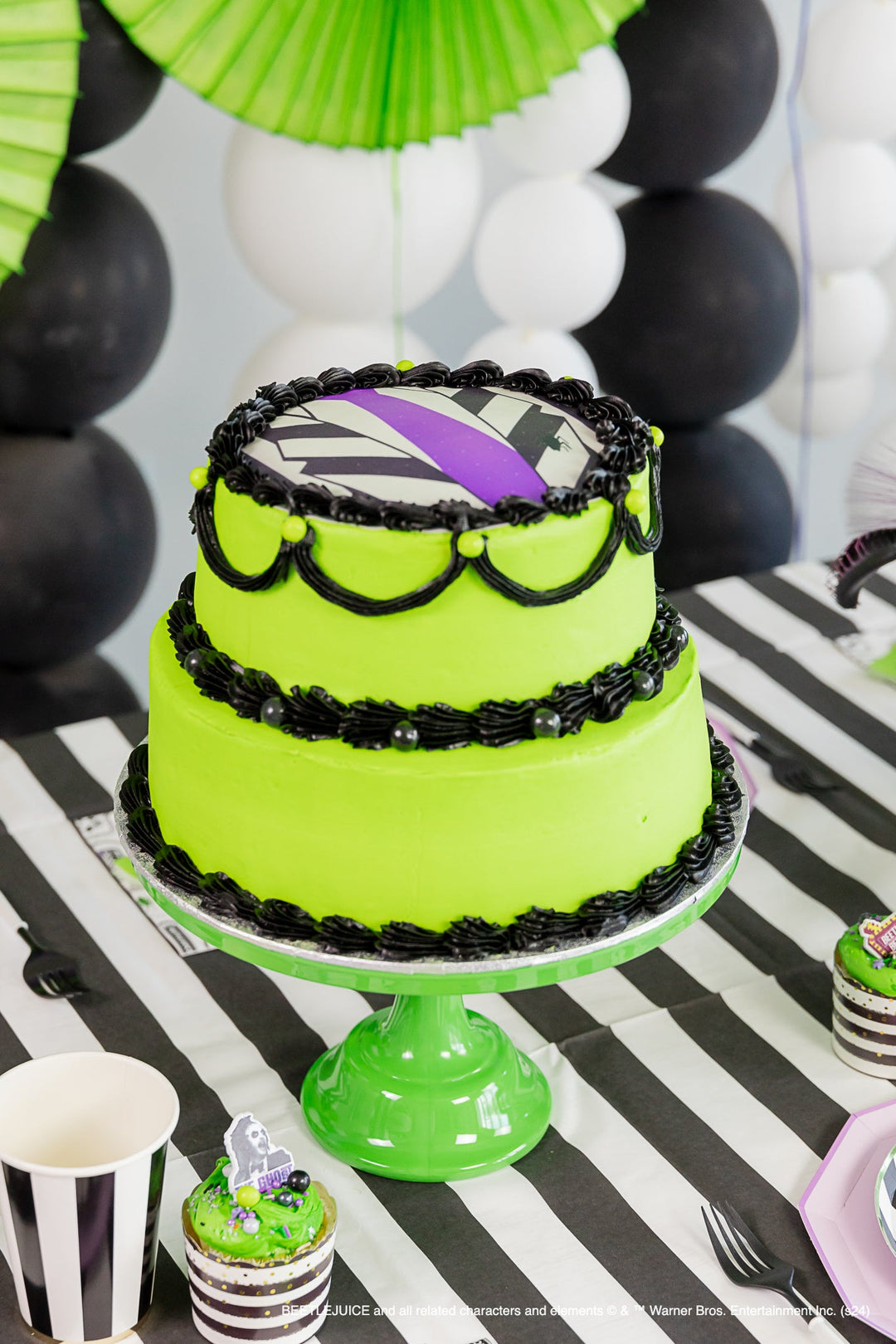 One of the most important elements of any Halloween party is the menu, and this one better be to die for! From frightful shrimp cocktails to Sandworm™ swiss rolls, there are many ways to embrace the odd and edgy vibe of the film with Beetlejuice party food. This lime green Beetlejuice-inspired cake for our fiendish fête had us screaming for more!