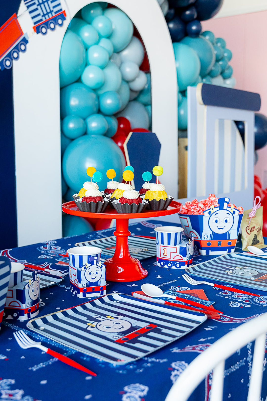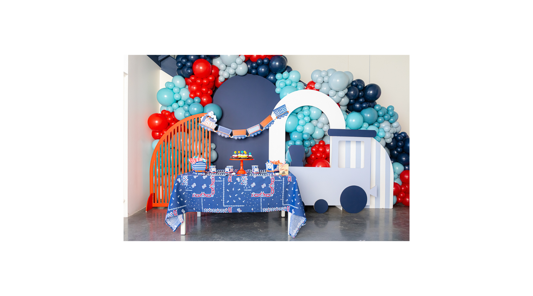 To get the party started, chugga-chugga-choose some whimsical railway-themed decorations. We created this charming railroad backdrop by layering an array of blue and red arches from Utah Party Backdrops before a brimming balloon garland from Pop Park City. Since this theme calls for lots of blue and red, we suggest incorporating a variety of hues to keep the space dimensional.