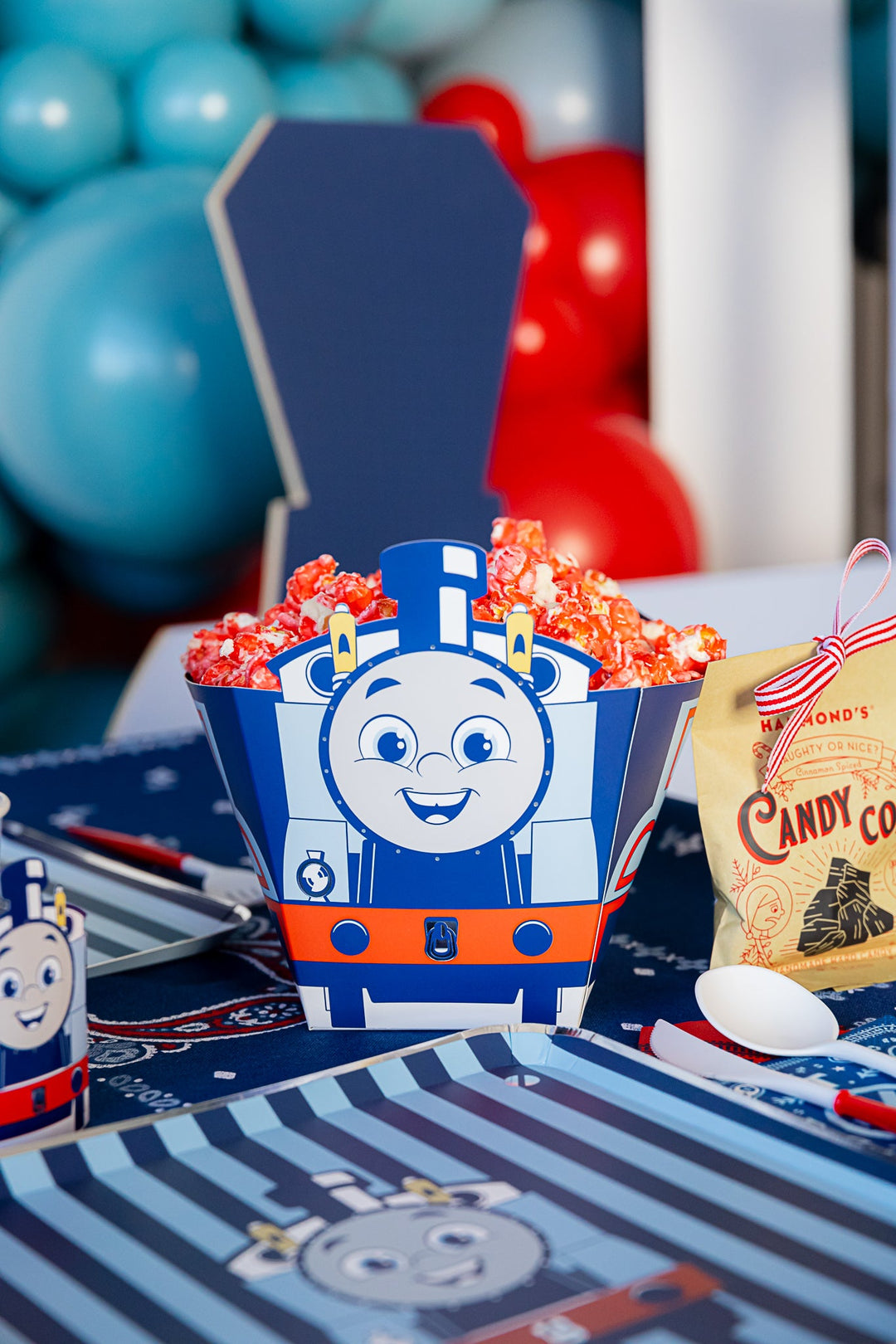 No train party is complete without something to snack on! Our Thomas & Friends Centerpiece is perfect for loading up with treats like popcorn, peanuts, and any other party food ideas you can imagine!