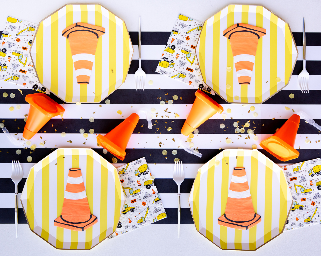Next, set each place with an eye-catching plate and a thematic napkin. Our Signature Soleil Yellow Cabana Stripe Plates are perfect for this party, and they complement these construction napkins wonderfully. For extra dimension, add a dump truck plate or a cone-shaped napkin on top. Complete the look with some construction cone cups and a sprinkling of orange confetti!