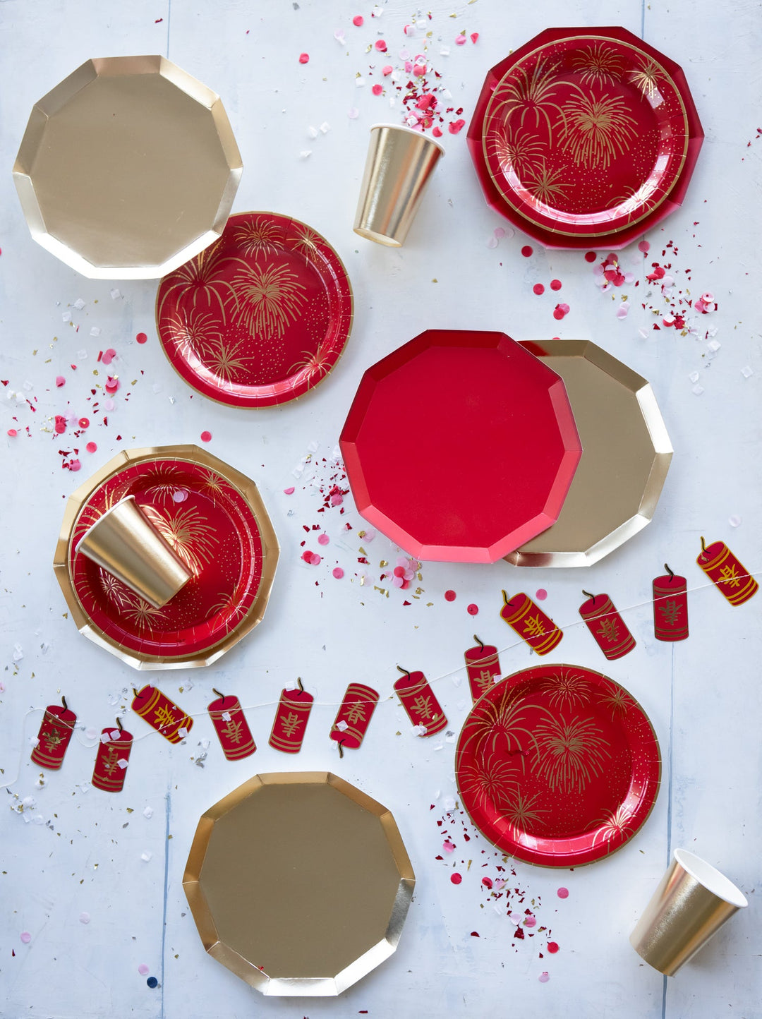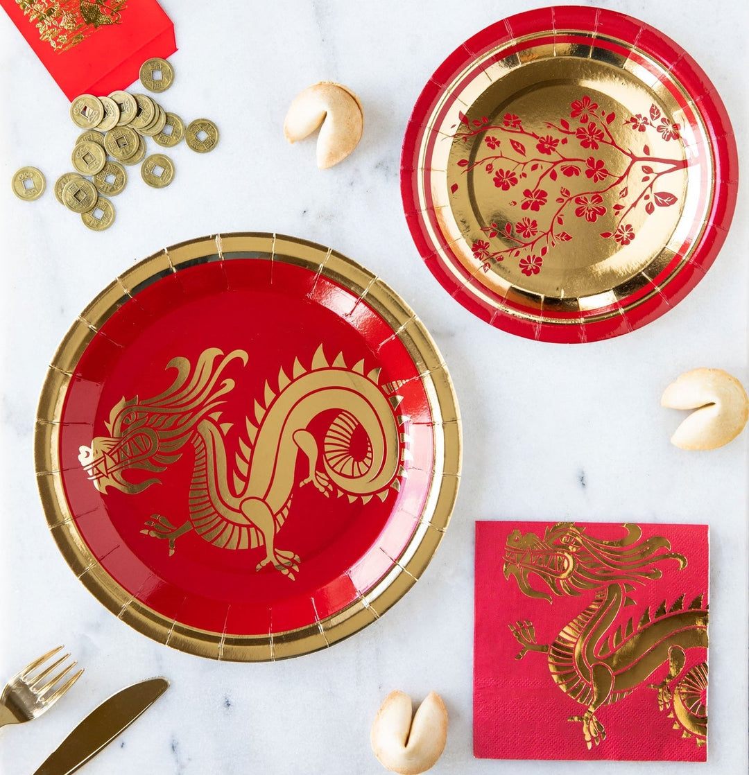 Ensure your feast is extra festive by preparing the perfect tablescape. We suggest alternating our Cherry Red Premium Dinner Plates with our Signature Gold Premium Dinner Plates. Then, layer a smaller firework plate, dragon plate, or floral plate on top.
