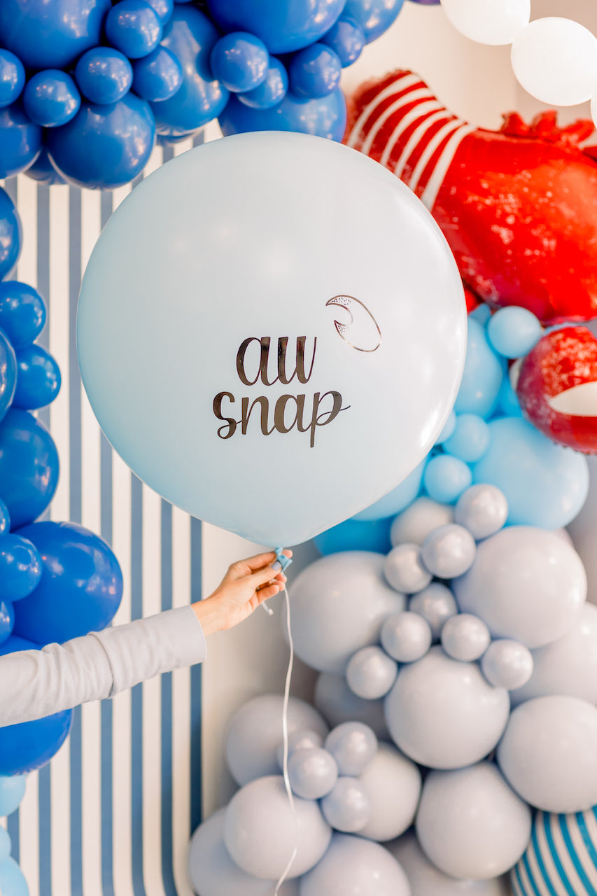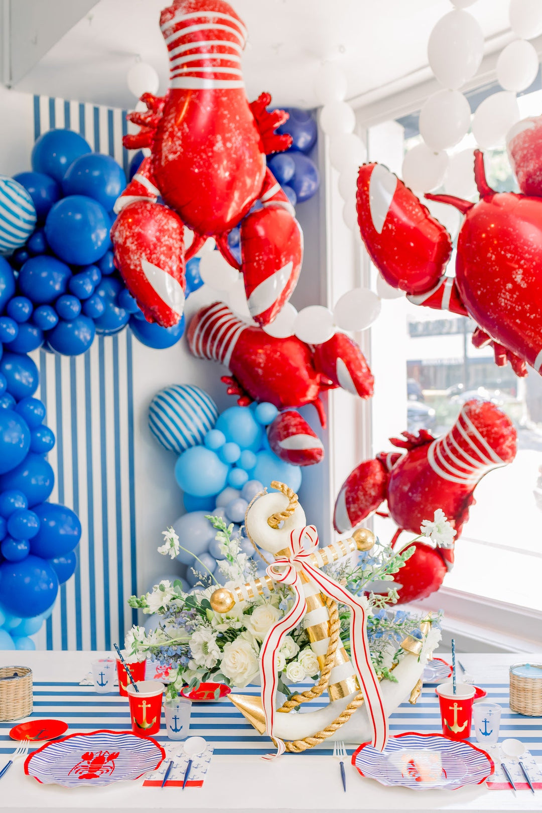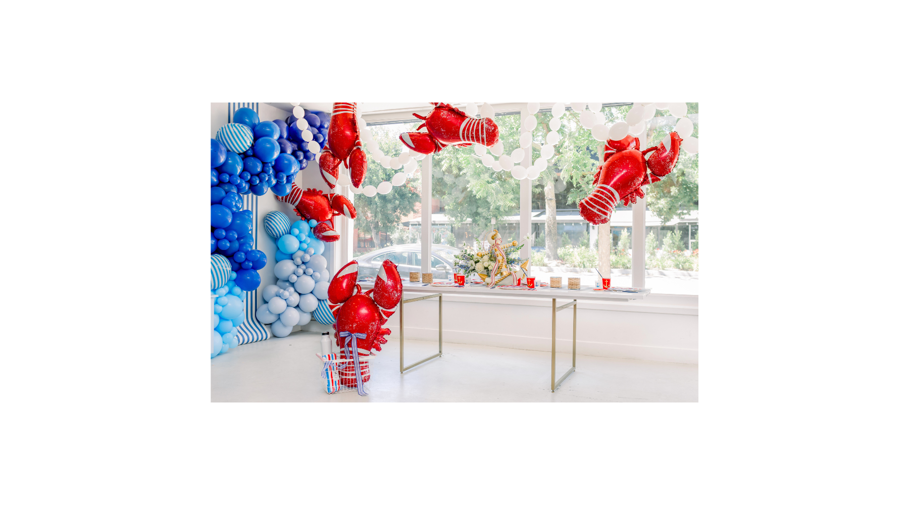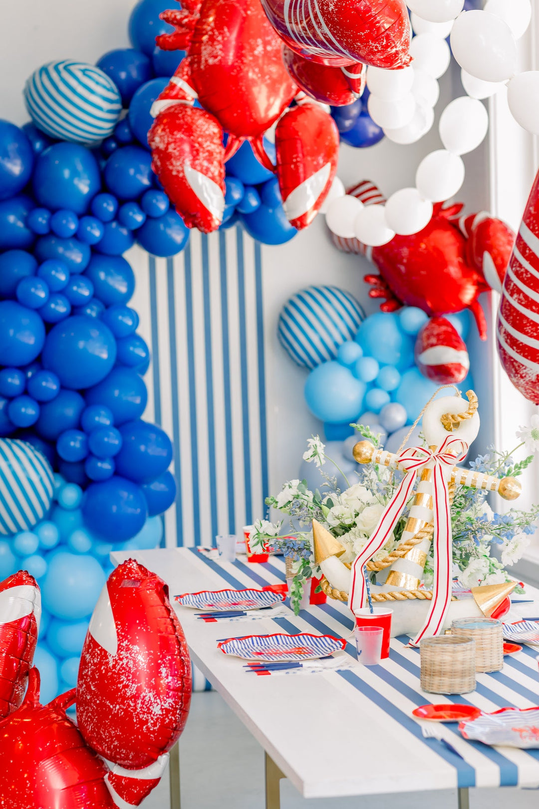Start by setting the scene with a brimming red, white, and blue balloon garland. We suggest incorporating a variety of shades to make your setting feel deep and detailed. Embellish it with a few shiny red lobster balloons, en voilà.