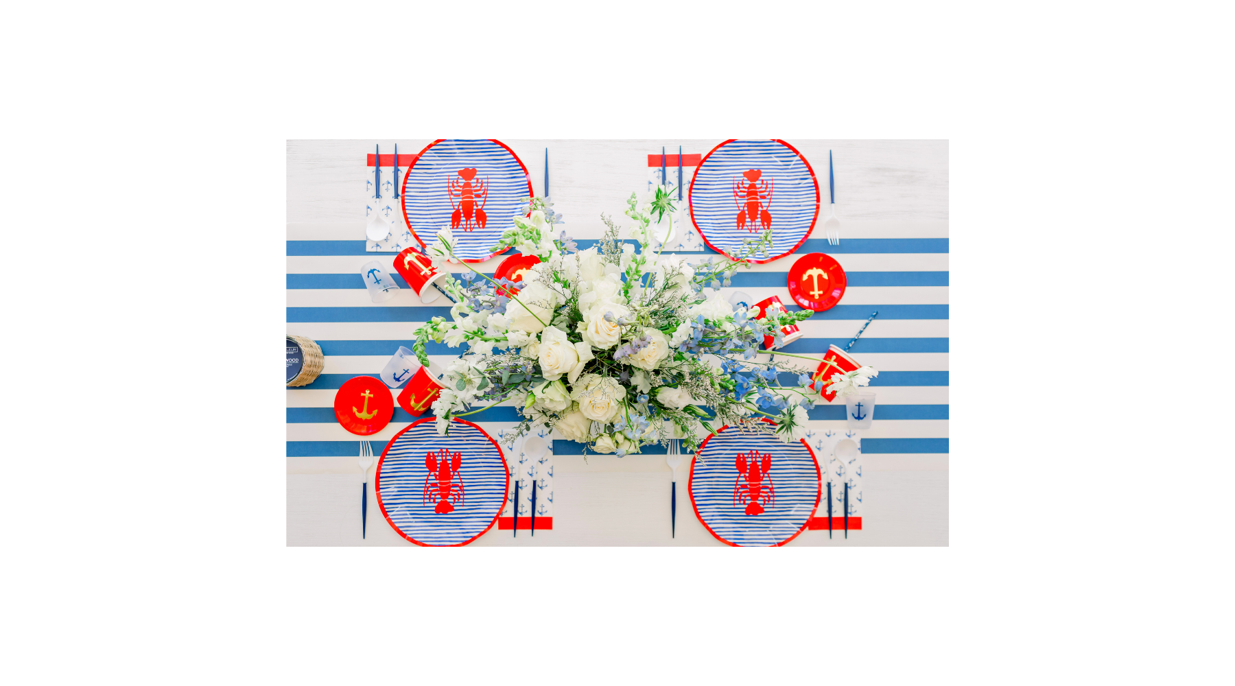 Now let’s crack into the tableware! Start by lining the center of your table with a blue and white striped runner. This will set the tone and provide a nautical base for your décor. Next, set each place with lobster plates, anchor napkins, and coordinating nautical-themed cups.