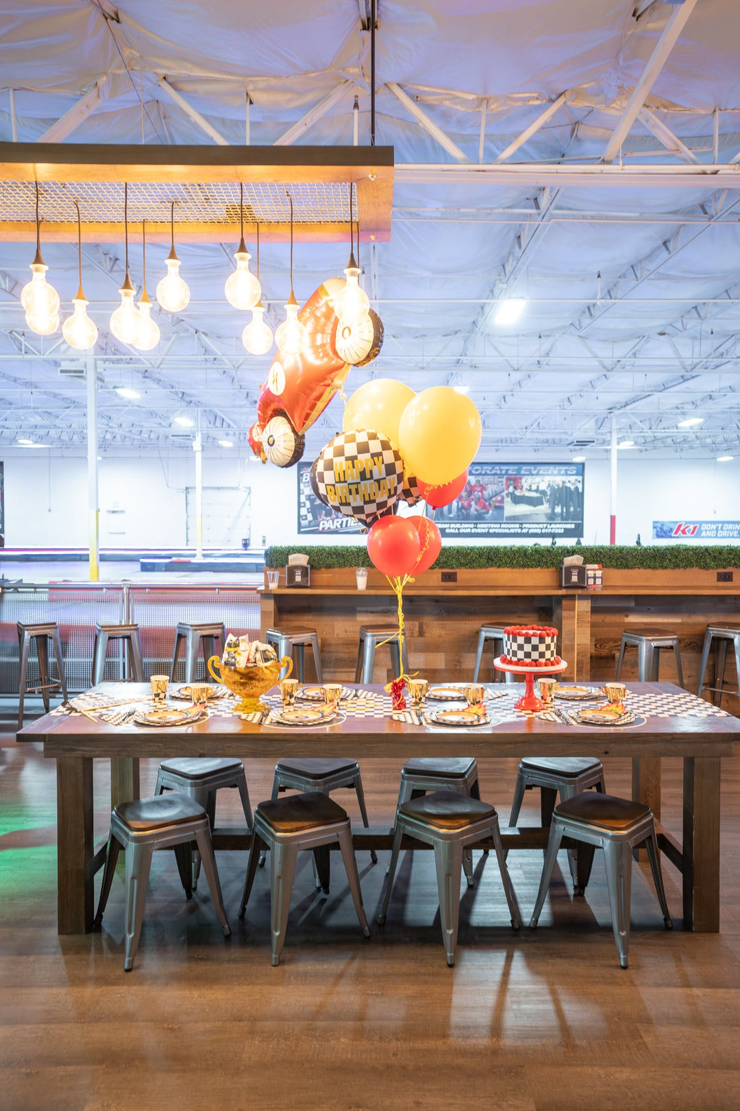 You can never go wrong with a classic balloon bouquet, especially if you’re hosting your party at an event center or actual race track. We suggest putting a large race car balloon in the center and embellishing the bouquet with lots of black and white checkered balloons, as well as yellow and red latex balloons. Complete the look with checkered flags and happy birthday banners to give the venue a roaring race-day feel.