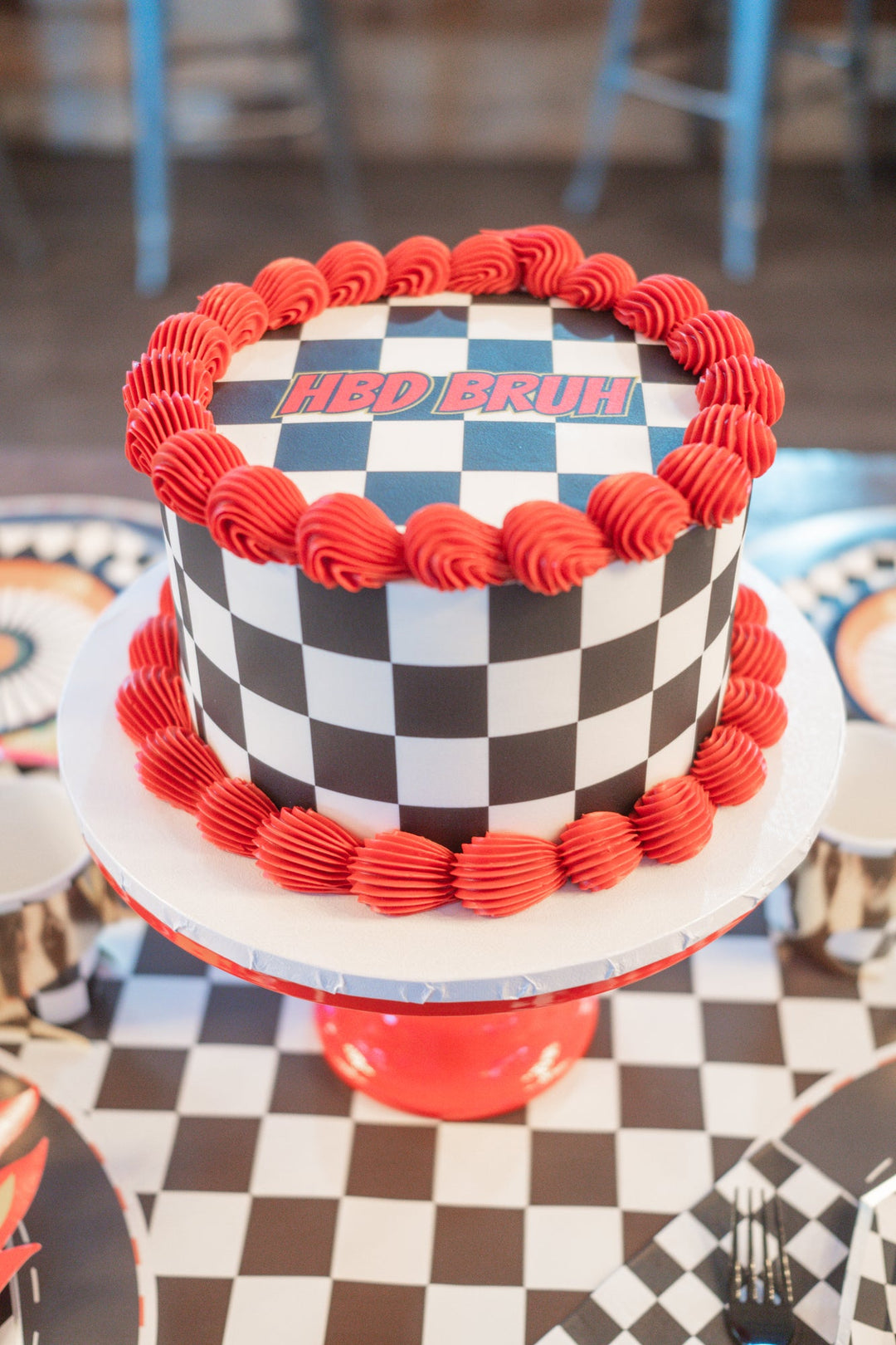 No race car-theme birthday party is complete without a 1st-place cake. Some rad ideas include a race track cake topped with tiny toy cars or a checkered cake decorated with classic racing lingo!