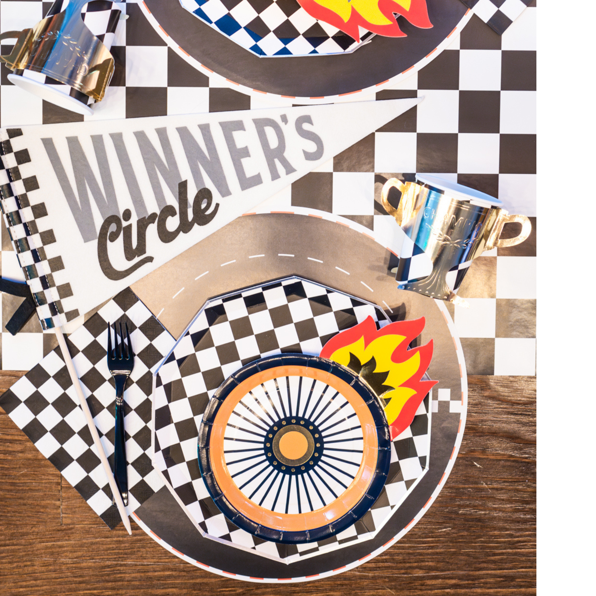 Regardless of your route, be sure to complete your tablescape with a black and white checkered table runner and coordinating plates and napkins. Finally, tie it all together with some shiny trophy cups!