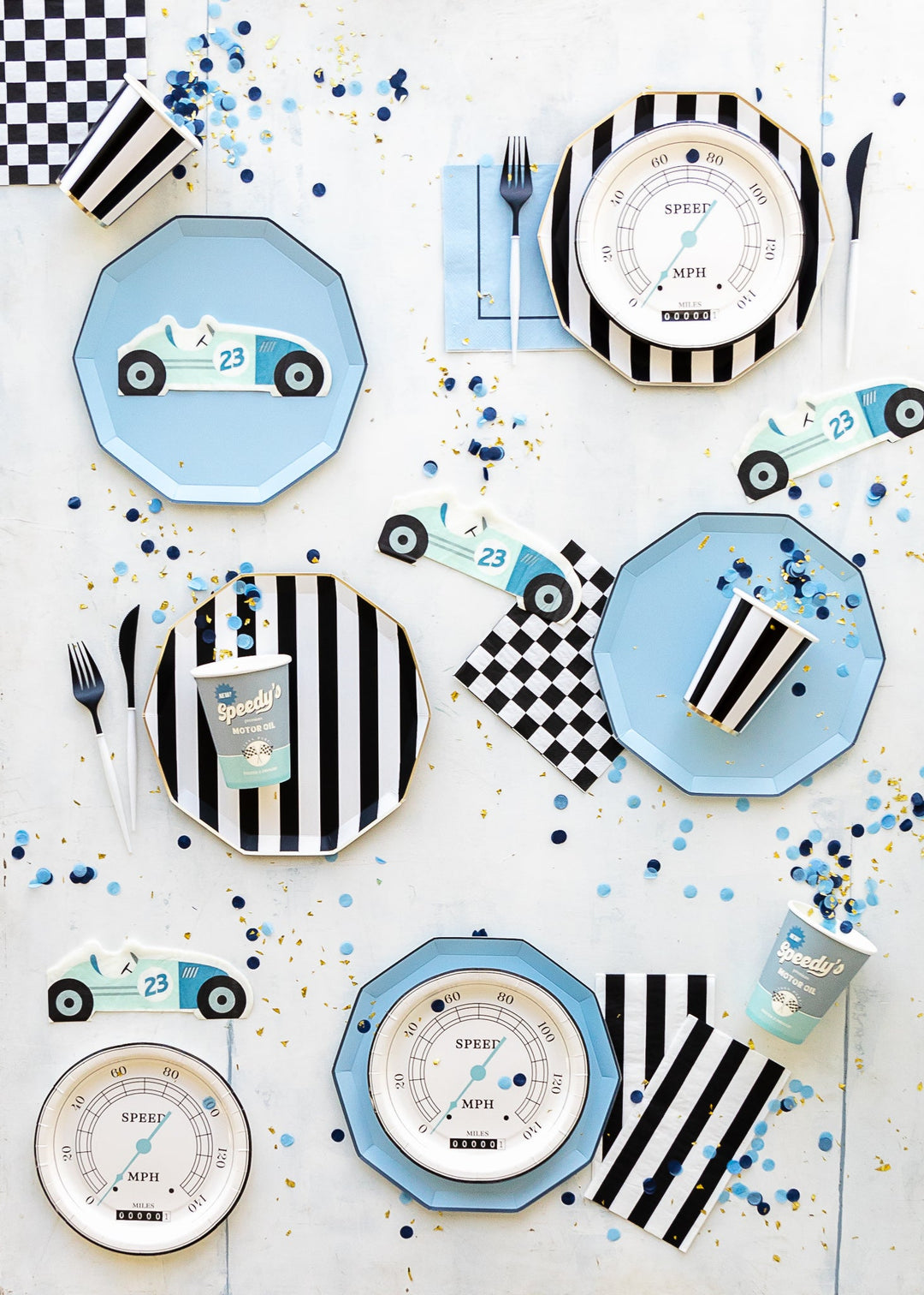 After you’ve set the scene for your speedy celebration, it’s time to switch gears and set the table. When it comes to race car party supplies, there are many directions you can take. These retro race car cups and speedometer plates are perfect for a little racer’s birthday bash; while these Hot Wheels plates and race track placemats are great for pre-teens.