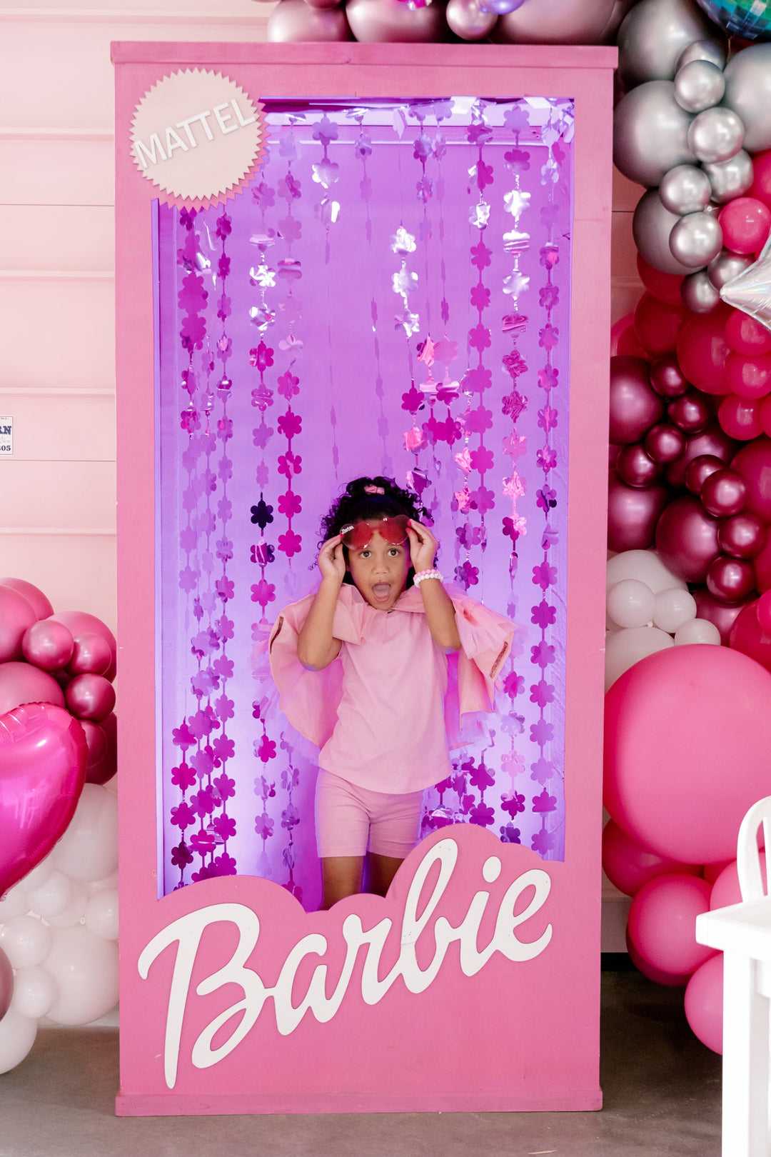 More than just the perfect Barbie party decoration, this prop will inspire some iconic Barbie photoshoots among your guests! We added a pink flower party curtain and some lights on the floor to make the best Barbie photo booth.