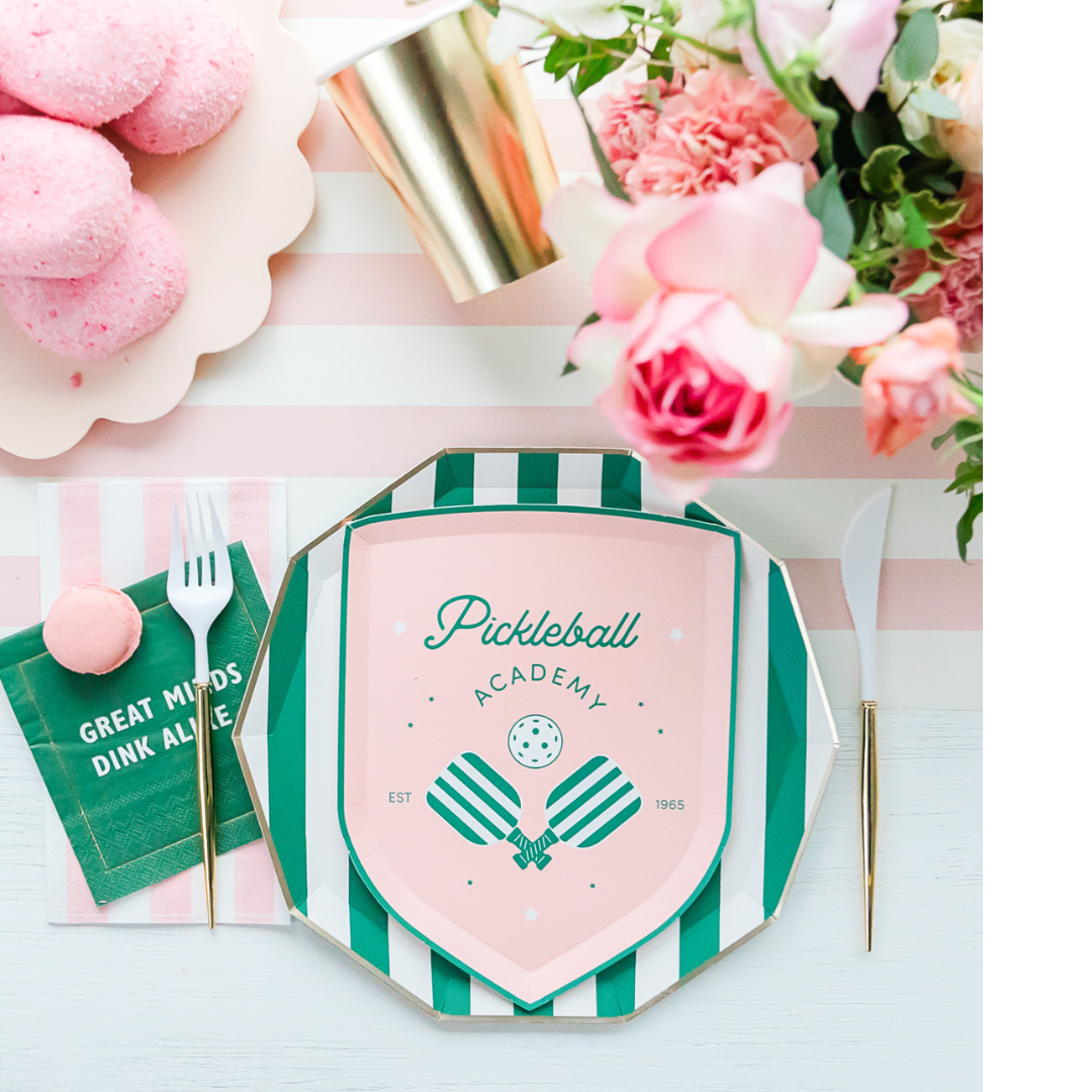 For this celebration, the party table is the real MVP. We recommend starting with our Le Picklebball Table Runner. Then, alternate some Emerald Green Cabana Stripe Plates and Napkins with some Petal Pink Cabana Stripe Plates and Napkins at each setting. Or, combine both colors with our Pink & Green Cabana Stripe Plates like @beijosevents did here! Complete the look by layering Le Pickleball Small Plates on top, en voila!