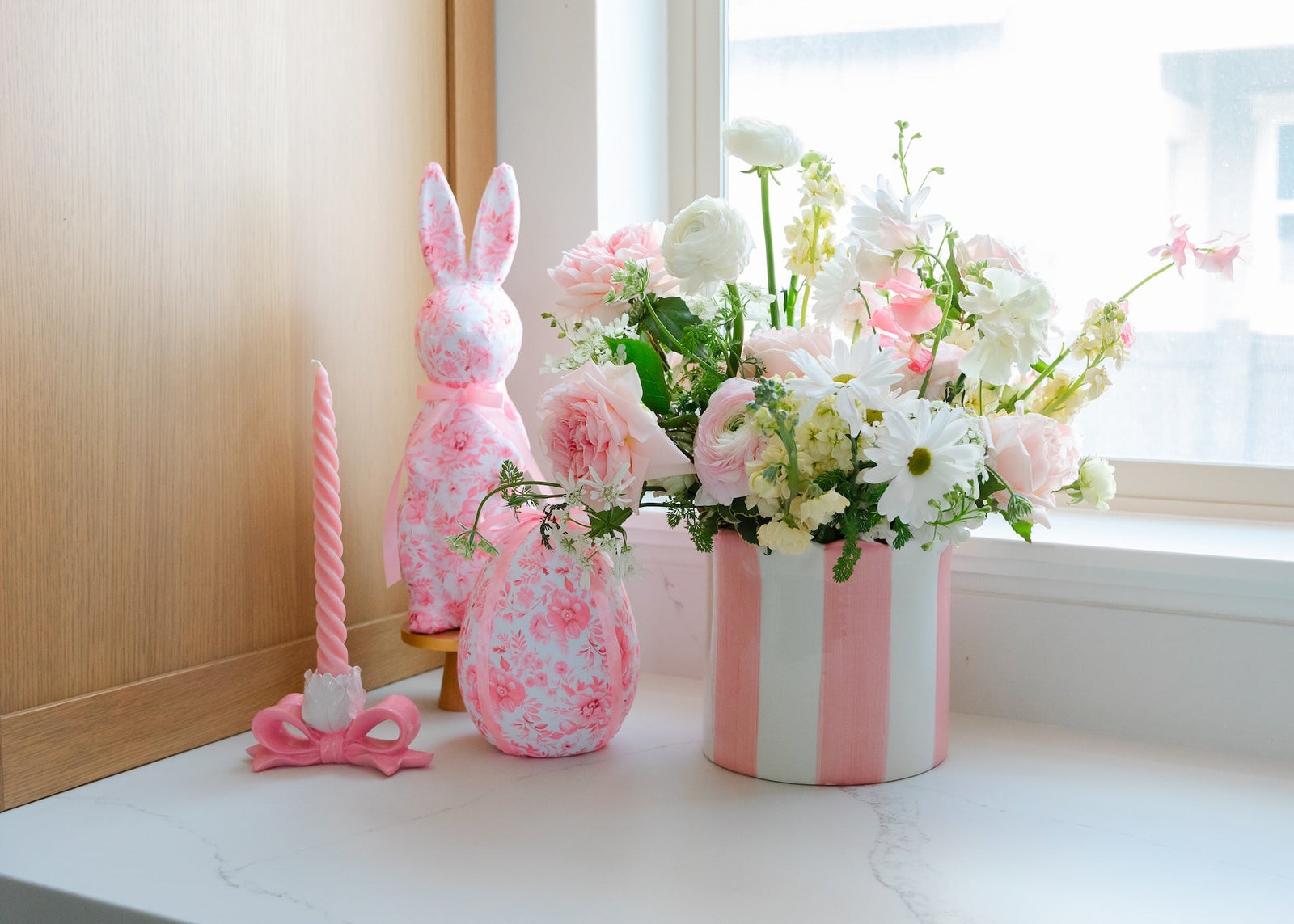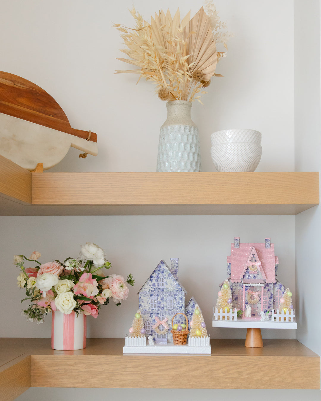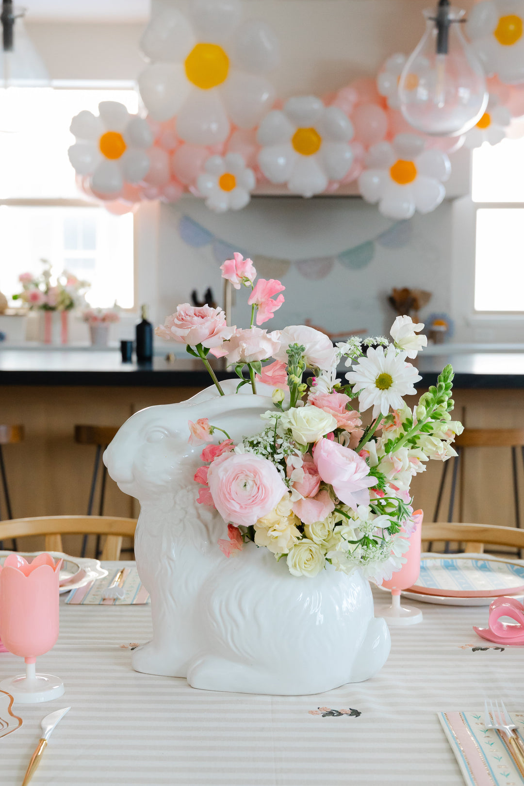 The spring season is a wonderful opportunity to decorate with fresh flowers. We suggest selecting a festive Easter-themed vessel, like a bunny vase or bucket, and filling it with a brimming bouquet. Shawn, from Flower Bar Co, created these Spring aesthetic arrangements that we displayed throughout the kitchen, living room, and dining room.