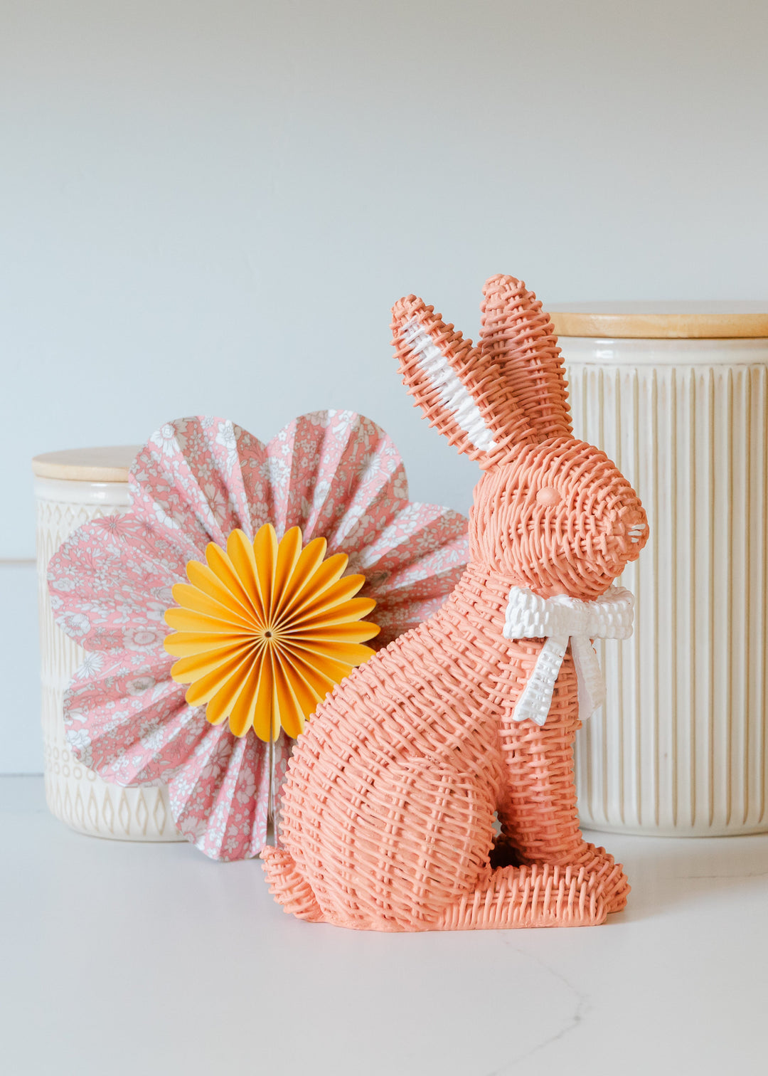Small, neutral Easter decorations add a festive touch without compromising the overall style and feel of your home. These basket weave wicker bunnies are some of our favorite modern Easter decorations.