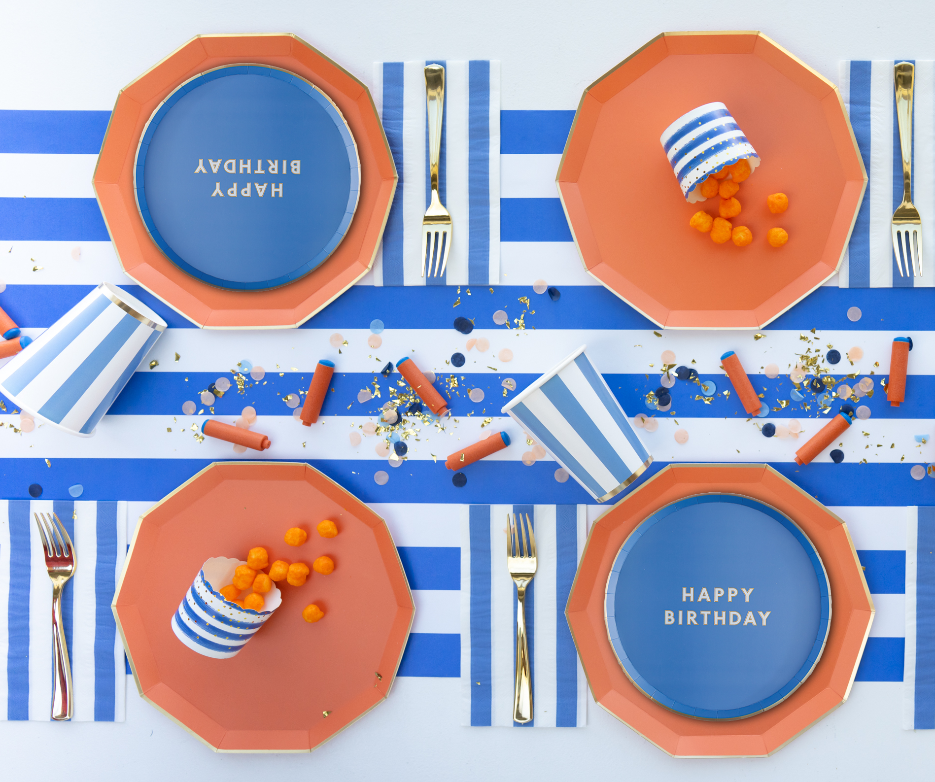 Once the battle has concluded, your fighters will be ready to fuel back up, so ensure your table is set for a celebratory feast. We opted for Palisades Blue stripes and Sunkissed Orange solids for this tablescape.