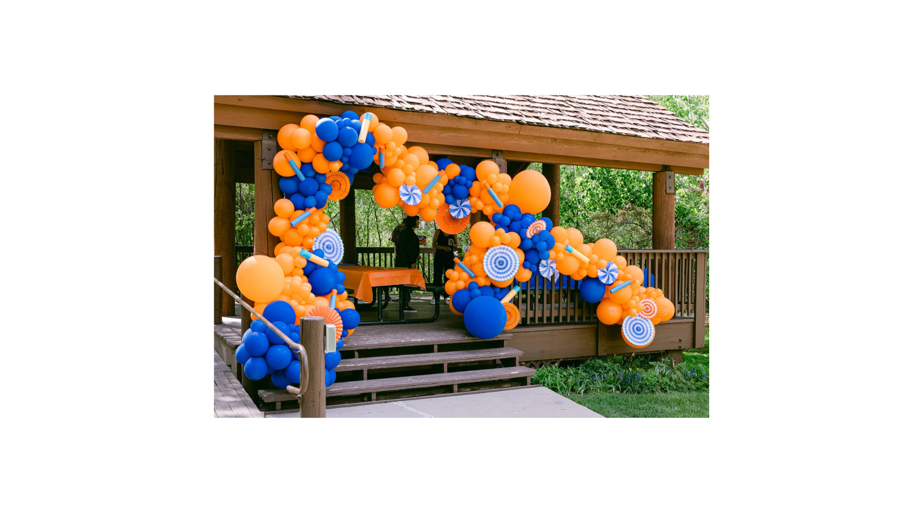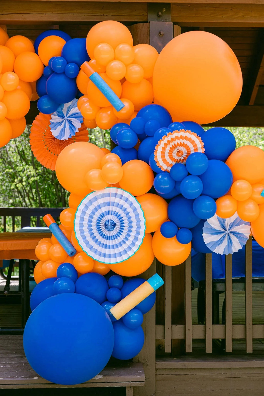 Wondering where to aim when it comes to Nerf party decorations? Since bright orange and cobalt blue are the distinguished colors of the brand, we suggest using them anywhere and everywhere. Our friends at Pop Park City made this striking balloon garland that we draped along the pavilion at our party spot.