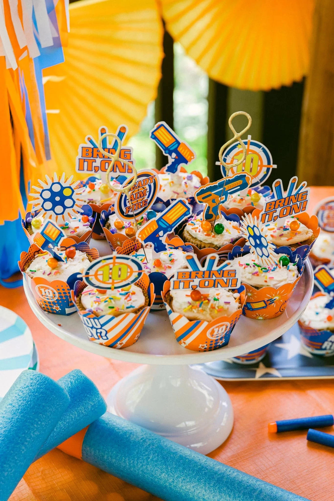 While birthday cakes are always a classic, we chose to serve cupcakes for this shootin’ shindig. We adorned them with Nerf-themed wrappers and toppers, but any cupcake kit with bright colors will do. This superhero kit is one of our favorites, and works perfectly with this action-packed party theme.