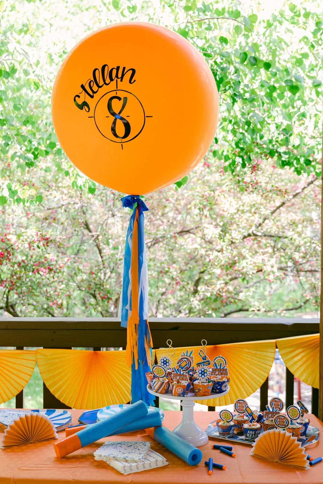The rest of your decor can be kept fairly minimal. After all, the real key to a sensational Nerf wars birthday party lies in the battle itself! We suggest a jumbo balloon and a few bunting fan garlands for final embellishments. (And if you're celebrating around the holidays, you can't go wrong with a Nerf-themed ornament).