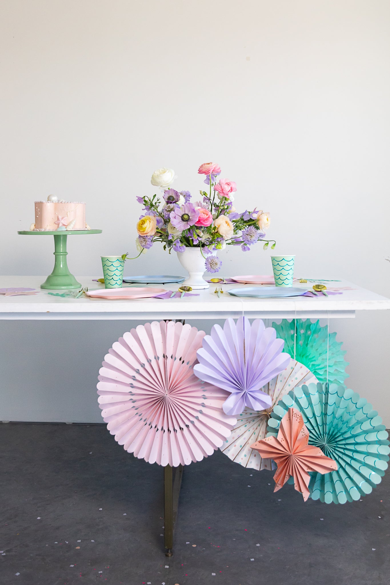 Mermaid party fans add a magical touch to any shell-ebration! Use them as a backdrop or as an added element in your tablescape. We love how they look paired with this seashell jumbo banner and a pastel floral arrangement. (Florals: Flower Bar Co).