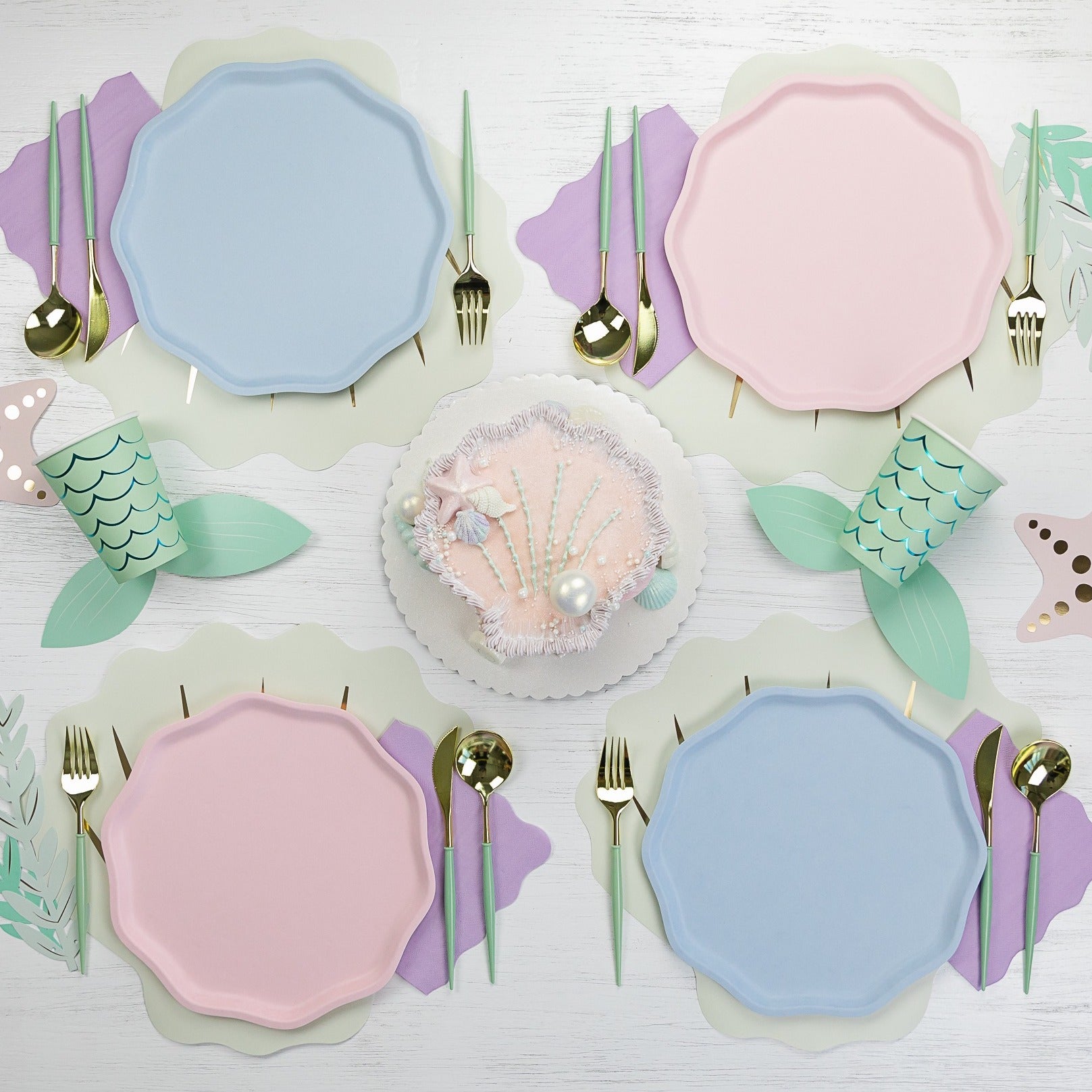For tableware, we recommend these magical watercolor clam shell plates and matching placemats. Or, you can experiment with iridescents and layer a shimmery shell plate with a scalloped blue or pink plate. Either way, don’t forget to complete each place setting with a mermaid party cup and a shiny set of cutlery!