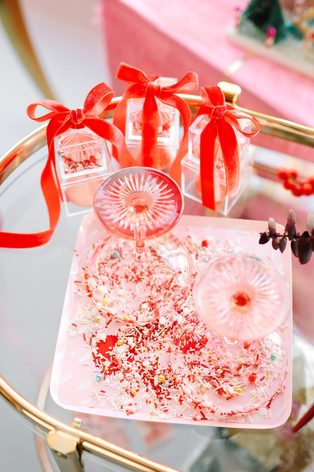 For drinks and treats, peppermint is the way to go! Small boxed candies are perfectly on-theme for this kind of celebration, so include some on your party table, or send them home with your guests. And, if you’re throwing an adult Christmas party, trim your glasses with peppermint sprinkles, and serve lots of juicy red cocktails. The more booze the merrier, right?