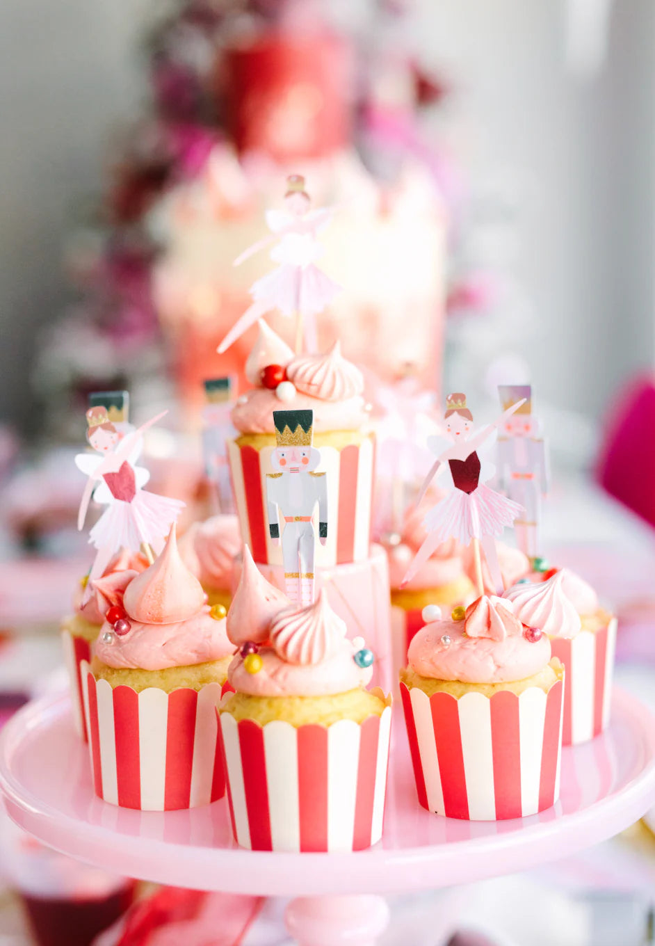 Speaking of sweets, may we recommend some delicious cupcakes decorated with Nutcracker themed toppers? These cute characters would make an adorable addition to your holiday party, and they come in a kit with matching red and white striped cupcake tins! Perfect for fun Christmas baking, cupcake decorating parties, or Nutcracker birthday parties.