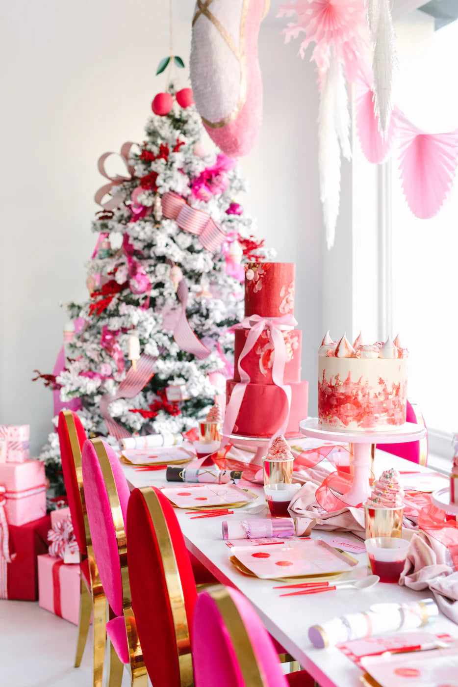 Let's talk about color palettes: Who said you can't add a little pink into the holiday season? We love the way pink pops against traditional Christmas colors, so we try to tie it into our holiday parties as often as we can. To curate that sweet sugar plum fairy party ambiance, decorate with shades of pastel pink, cherry red, and glistening gold.